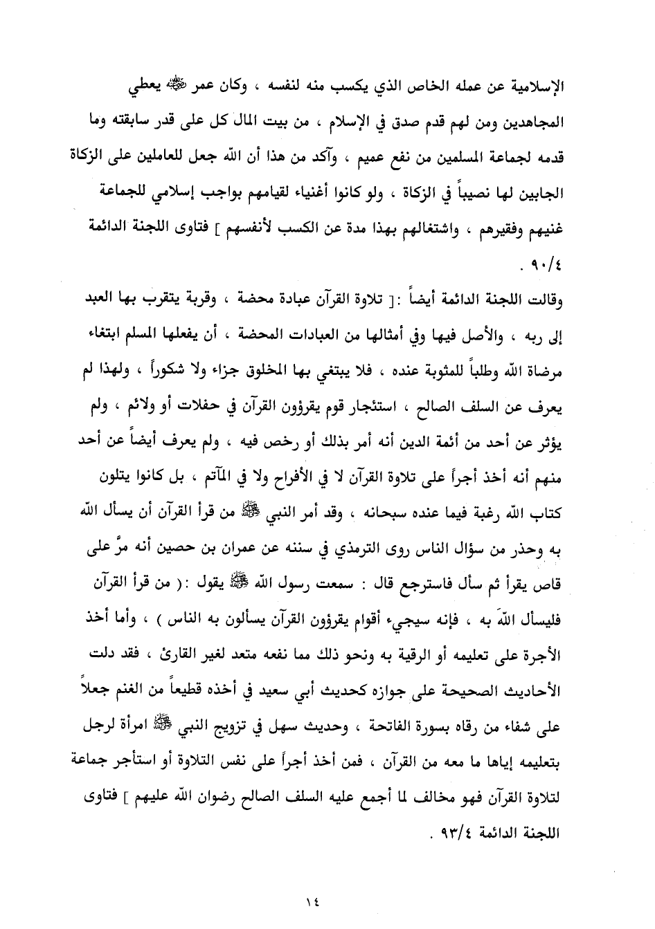 وقالت اللجنة الدائمة أيضاً: [تلاوة القرآن عبادة محضة، وقربة يتقرب بها العبد إلى ربه، والأصل فيها وفي أمثالها من العبادات المحضة، أن يفعلها المسلم ابتغاء مرضاة الله وطلباً للمثوبة عنده، فلا يبتغي بها المخلوق جزاء ولا شكوراً، ولهذا لم يعرف عن السلف الصالح، استئجار قوم يقرؤون القرآن في حفلات أو ولائم، ولم يؤثر عن أحد من أئمة الدين أنه أمر بذلك أو رخص فيه، ولم يعرف أيضاً عن أحد منهم أنه أخذ أجراً على تلاوة القرآن لا في الأفراح ولا في المآتم، بل كانوا يتلون كتاب الله رغبة فيما عنده سبحانه، وقد أمر النبي - صلى الله عليه وسلم - من قرأ القرآن أن يسأل الله به وحذر من سؤال الناس روى الترمذي في سننه عن عمران بن حصين أنه مرَّ على قاص يقرأ ثم سأل فاسترجع قال: سمعت رسول الله - صلى الله عليه وسلم - يقول: (من قرأ القرآن فليسأل اللهَ به، فإنه سيجيء أقوام يقرؤون القرآن يسألون به الناس)، وأما أخذ الأجرة على تعليمه أو الرقية به ونحو ذلك مما نفعه متعد لغير القارئ، فقد دلت الأحاديث الصحيحة على جوازه كحديث أبي سعيد في أخذه قطيعاً من الغنم جعلاً على شفاء من رقاه بسورة الفاتحة، وحديث سهل في تزويج النبي - صلى الله عليه وسلم - امرأة لرجل بتعليمه إياها ما معه من القرآن، فمن أخذ أجراً على نفس التلاوة أو استأجر جماعة لتلاوة القرآن فهو مخالف لما أجمع عليه السلف الصالح رضوان الله عليهم] فتاوى اللجنة الدائمة 4/ 93.