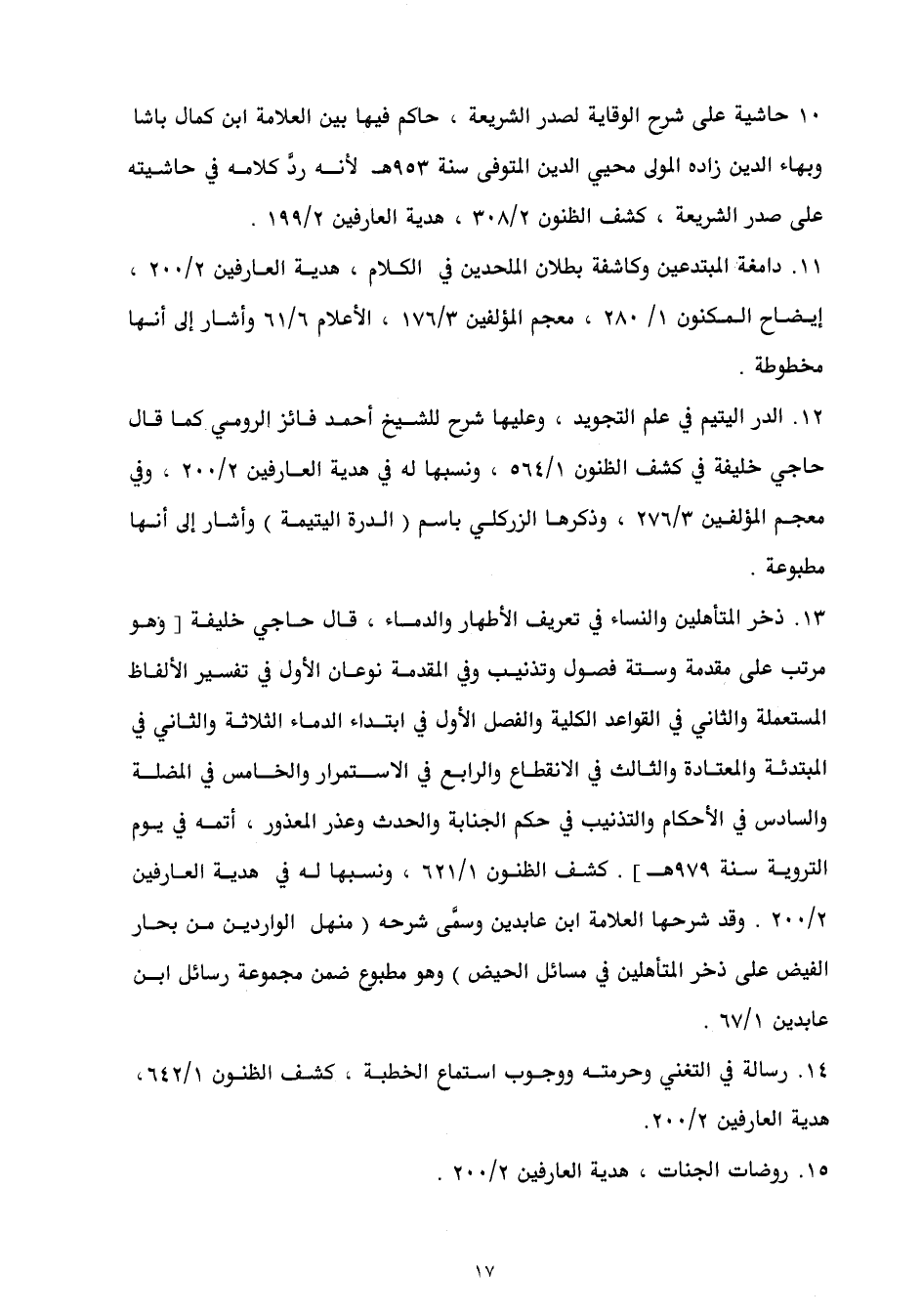 13. ذخر المتأهلين والنساء في تعريف الأطهار والدماء، قال حاجي خليفة [وهو مرتب على مقدمة وستة فصول وتذنيب وفي المقدمة نوعان الأول في تفسير الألفاظ المستعملة والثاني في القواعد الكلية والفصل الأول في ابتداء الدماء الثلاثة والثاني في المبتدئة والمعتادة والثالث في الانقطاع والرابع في الاستمرار والخامس في المضلة والسادس في الأحكام والتذنيب في حكم الجنابة والحدث وعذر المعذور، أتمه في يوم التروية سنة 979هـ]. كشف الظنون 1/ 621، ونسبها له في هدية العارفين 2/ 200. وقد شرحها العلامة ابن عابدين وسمَّى شرحه (منهل الواردين من بحار الفيض على ذخر المتأهلين في مسائل الحيض) وهو مطبوع ضمن مجموعة رسائل ابن عابدين 1/ 67.