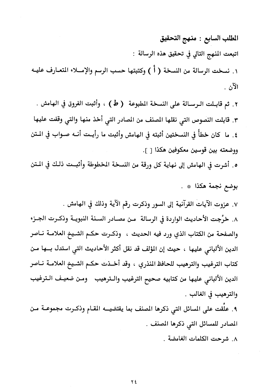 8. خرَّجت الأحاديث الواردة في الرسالة من مصادر السنة النبوية وذكرت الجزء والصفحة من الكتاب الذي ورد فيه الحديث، وذكرت حكم الشيخ العلامة ناصر الدين الألباني عليها، حيث إن المؤلف قد نقل أكثر الأحاديث التي استدل بها من كتاب الترغيب والترهيب للحافظ المنذري، وقد أخذت حكم الشيخ العلامة ناصر الدين الألباني عليها من كتابيه صحيح الترغيب والترهيب ومن ضعيف الترغيب والترهيب في الغالب.