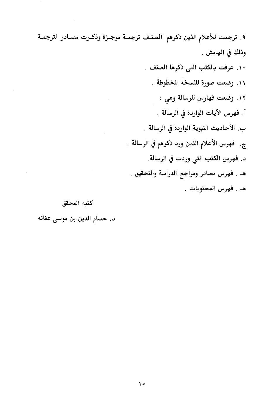 9. ترجمت للأعلام الذين ذكرهم المصنف ترجمة موجزة وذكرت مصادر الترجمة وذلك في الهامش.