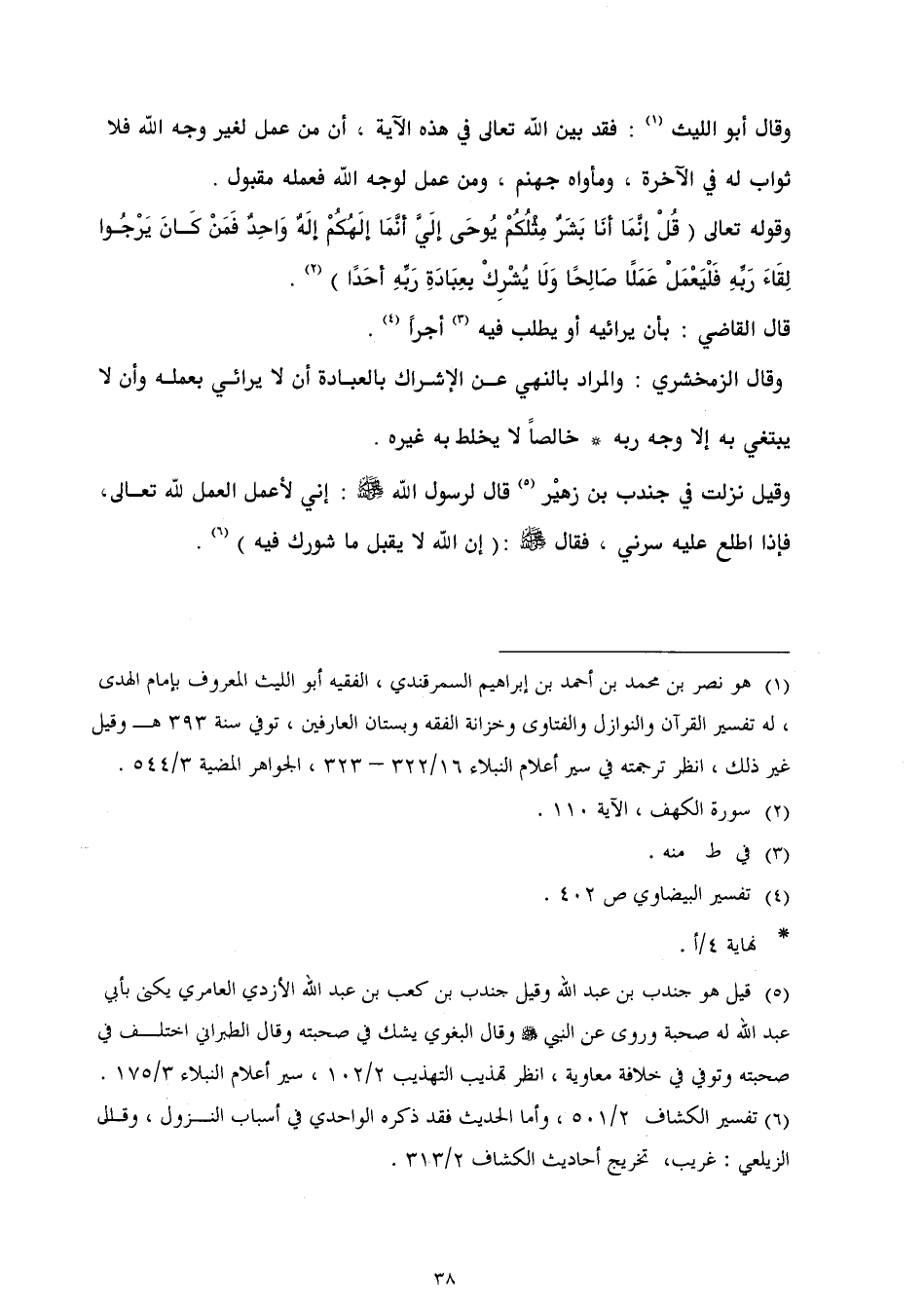 (¬1) هو نصر بن محمد بن أحمد بن إبراهيم السمرقندي، الفقيه أبو الليث المعروف بإمام الهدى، له تفسير القرآن والنوازل والفتاوى وخزانة الفقه وبستان العارفين، توفي سنة 393 هـ وقيل غير ذلك، انظر ترجمته في سير أعلام النبلاء 16/ 322 - 323، الجواهر المضية 3/ 544.