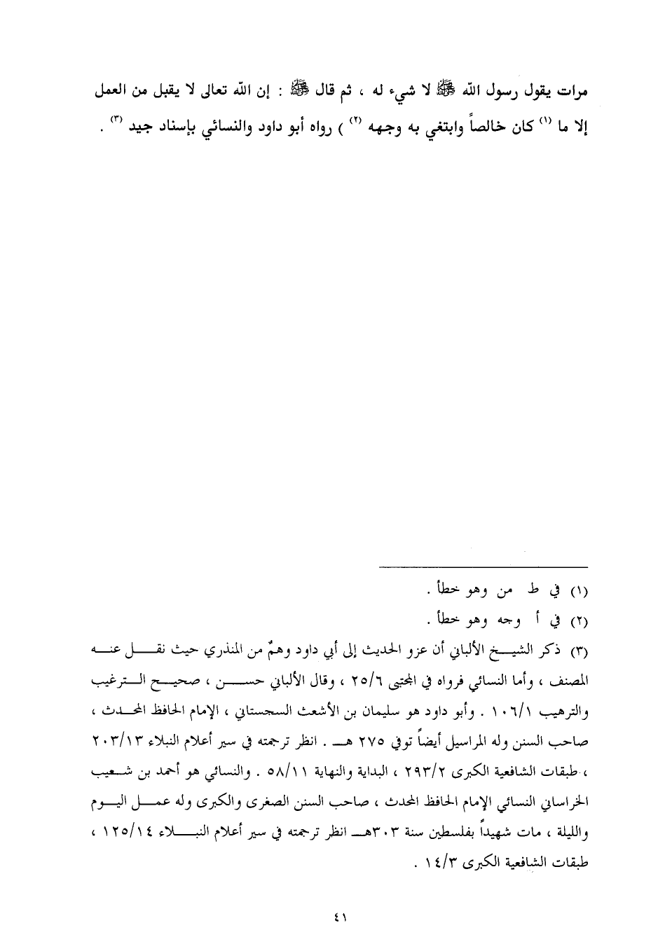 (¬3) ذكر الشيخ الألباني أن عزو الحديث إلى أبي داود وهمٌ من المنذري حيث نقل عنه المصنف، وأما النسائي فرواه في المجتبى 6/ 25، وقال الألباني حسن، صحيح الترغيب والترهيب 1/ 106. وأبو داود هو سليمان بن الأشعث السجستاني، الإمام الحافظ المحدث، صاحب السنن وله المراسيل أيضاً توفي 275 هـ. انظر ترجمته في سير أعلام النبلاء 13/ 203، طبقات الشافعية الكبرى 2/ 293، البداية والنهاية 11/ 58. والنسائي هو أحمد بن شعيب الخراساني النسائي الإمام الحافظ المحدث، صاحب السنن الصغرى والكبرى وله عمل اليوم والليلة، مات شهيداً بفلسطين سنة 303هـ انظر ترجمته في سير أعلام النبلاء 14/ 125، طبقات الشافعية الكبرى 3/ 14.