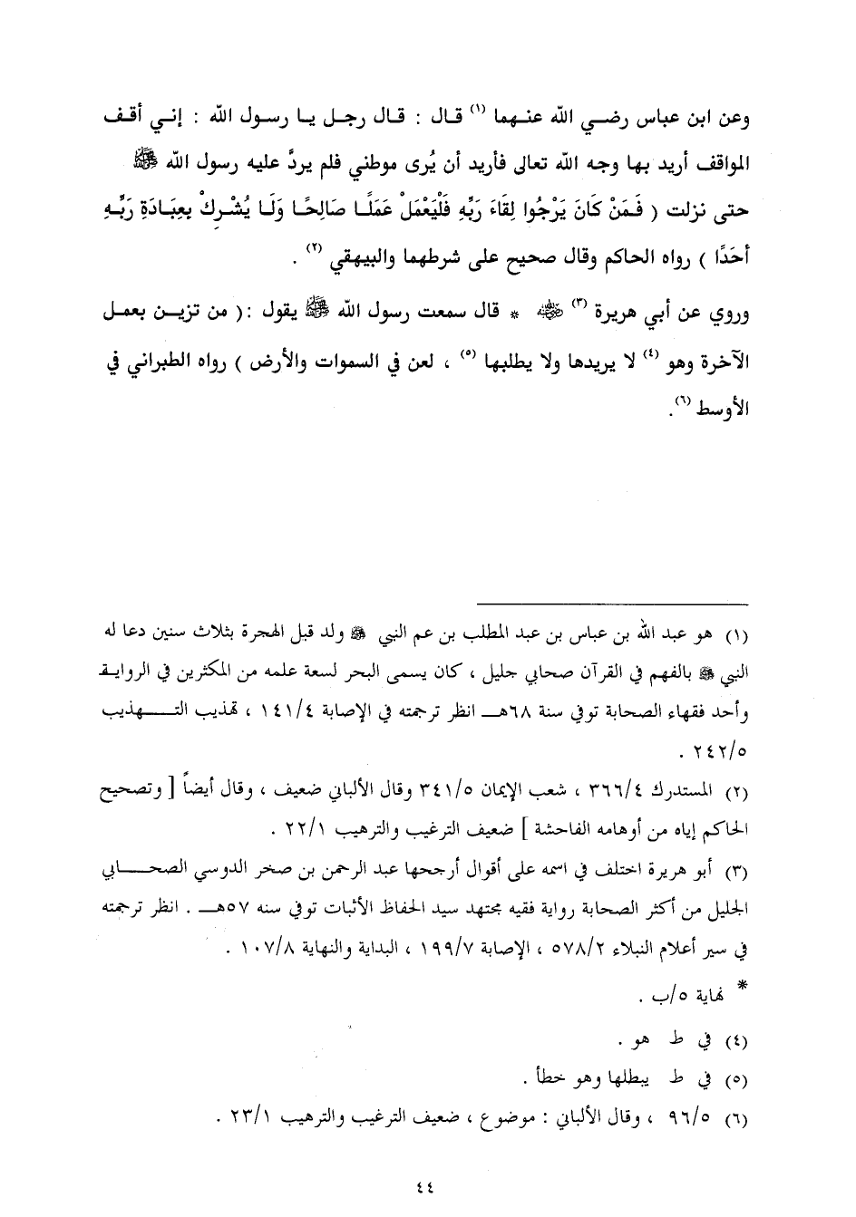 (¬2) المستدرك 4/ 366، شعب الإيمان 5/ 341 وقال الألباني ضعيف، وقال أيضاً [وتصحيح الحاكم إياه من أوهامه الفاحشة] ضعيف الترغيب والترهيب 1/ 22.