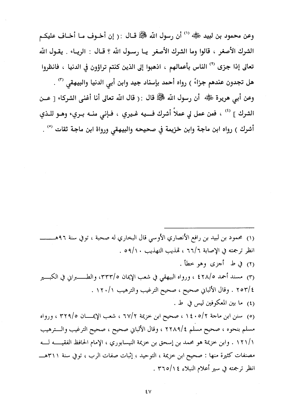 وعن محمود بن لبيد - رضي الله عنه - (¬1) أن رسول الله - صلى الله عليه وسلم - قال: (إن أخوف ما أخاف عليكم الشرك الأصغر، قالوا وما الشرك الأصغر يا رسول الله؟ قال: الرياء. يقول الله تعالى إذا جزى (¬2) الناس بأعمالهم، اذهبوا إلى الذين كنتم تراؤون في الدنيا، فانظروا هل تجدون عندهم جزاءً) رواه أحمد بإسناد جيد وابن أبي الدنيا والبيهقي (¬3).