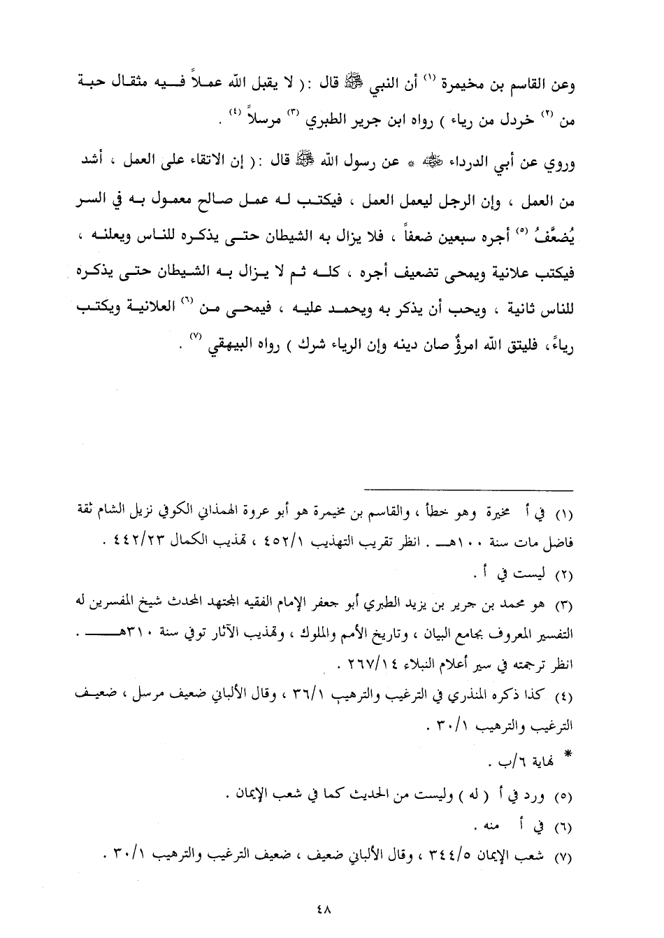 وعن القاسم بن مخيمرة (¬1) أن النبي - صلى الله عليه وسلم - قال: (لا يقبل الله عملاً فيه مثقال حبة من (¬2) خردل من رياء) رواه ابن جرير الطبري (¬3) مرسلاً (¬4).