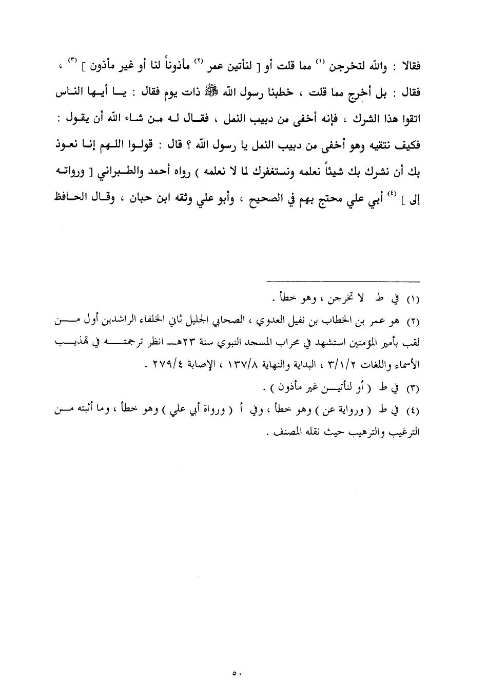 فقالا: والله لتخرجن (¬1) مما قلت أو [لنأتين عمر (¬2) مأذوناً لنا أو غير مأذون] (¬3)، فقال: بل أخرج مما قلت، خطبنا رسول الله - صلى الله عليه وسلم - ذات يوم فقال: يا أيها الناس اتقوا هذا الشرك، فإنه أخفى من دبيب النمل، فقال له من شاء الله أن يقول: فكيف نتقيه وهو أخفى من دبيب النمل يا رسول الله؟ قال: قولوا اللهم إنا نعوذ بك أن نشرك بك شيئاً نعلمه ونستغفرك لما لا نعلمه) رواه أحمد والطبراني [ورواته إلى] (¬4) أبي علي محتج بهم في الصحيح، وأبو علي وثقه ابن حبان، وقال الحافظ