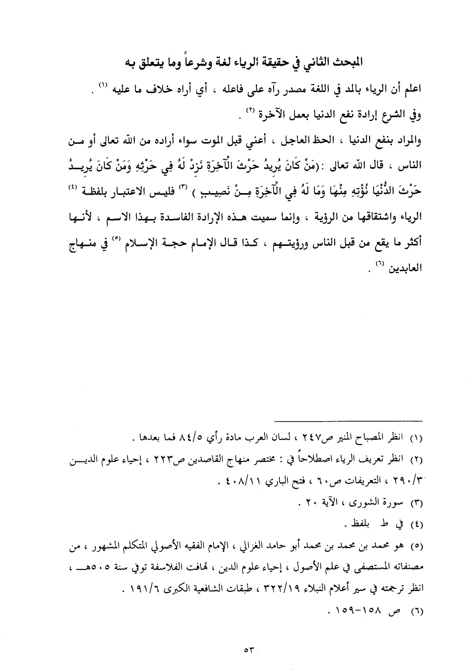 (¬2) انظر تعريف الرياء اصطلاحاً في: مختصر منهاج القاصدين ص223، إحياء علوم الدين 3/ 290، التعريفات ص60، فتح الباري 11/ 408.