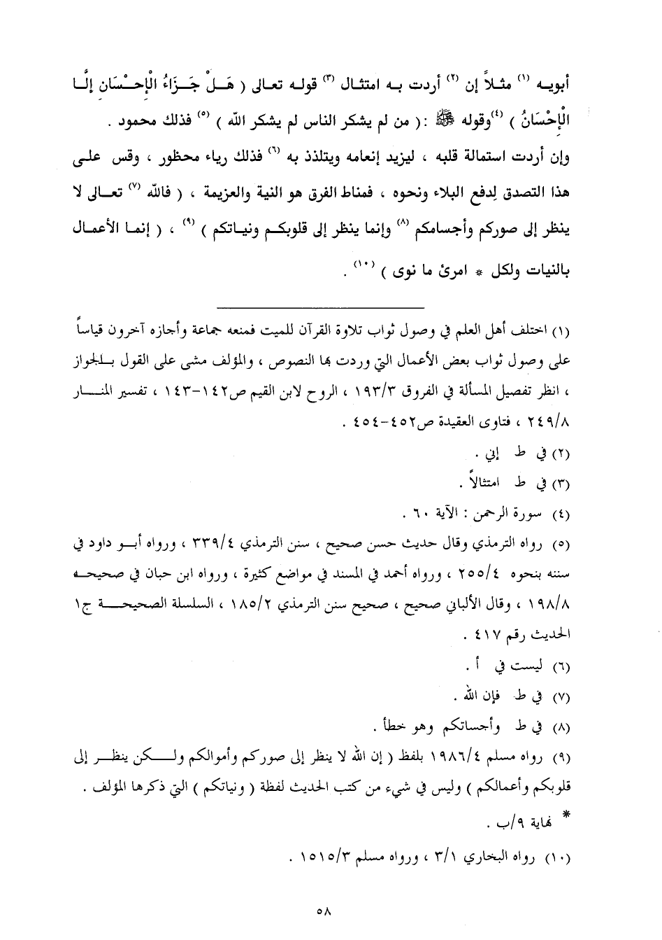(¬9) رواه مسلم 4/ 1986 بلفظ (إن الله لا ينظر إلى صوركم وأموالكم ولكن ينظر إلى قلوبكم وأعمالكم) وليس في شيء من كتب الحديث لفظة (ونياتكم) التي ذكرها المؤلف.