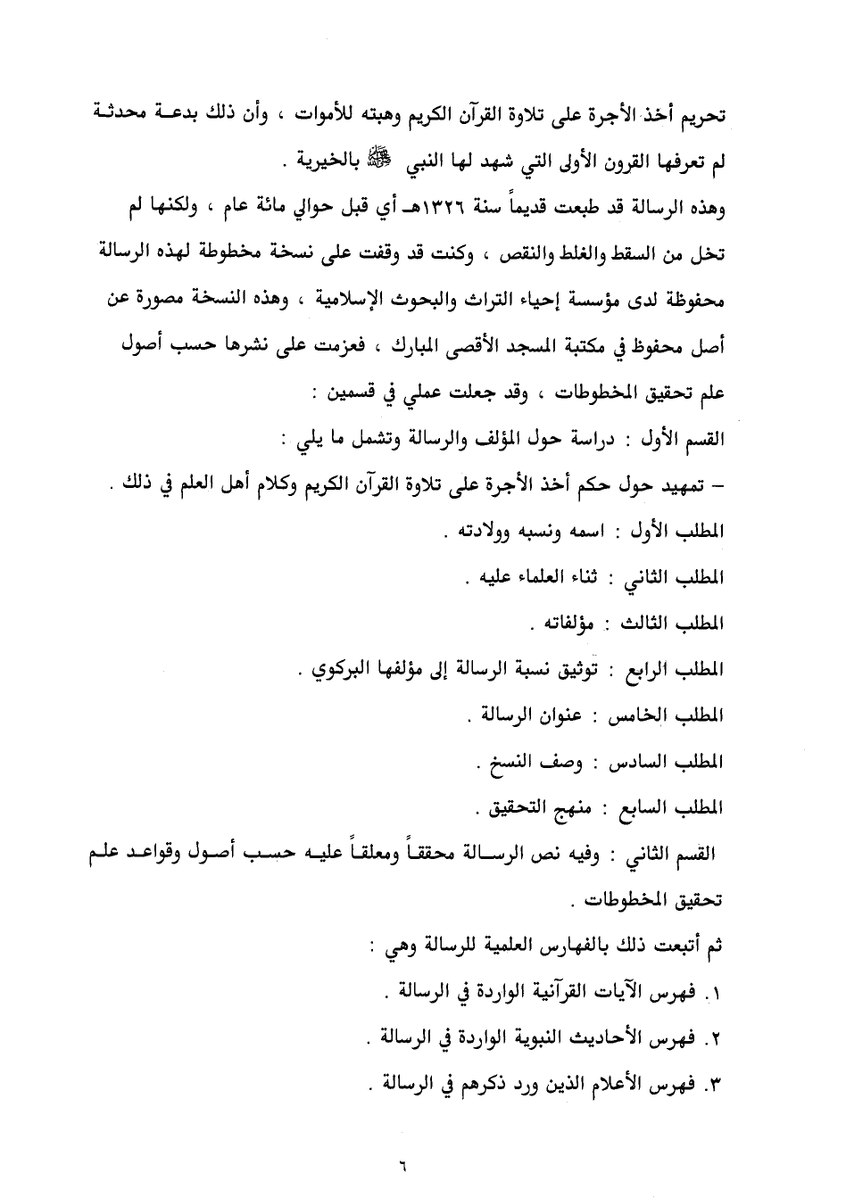 وهذه الرسالة قد طبعت قديماً سنة 1326هـ أي قبل حوالي مائة عام، ولكنها لم تخل من السقط والغلط والنقص، وكنت قد وقفت على نسخة مخطوطة لهذه الرسالة محفوظة لدى مؤسسة إحياء التراث والبحوث الإسلامية، وهذه النسخة مصورة عن أصل محفوظ في مكتبة المسجد الأقصى المبارك، فعزمت على نشرها حسب أصول علم تحقيق المخطوطات، وقد جعلت عملي في قسمين: