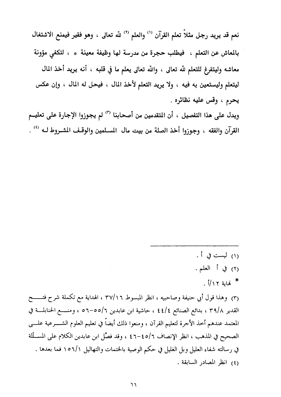 (¬4) وهذا قول أبي حنيفة وصاحبيه، انظر المبسوط 16/ 37، الهداية مع تكملة شرح فتح القدير 8/ 39، بدائع الصنائع 4/ 44، حاشية ابن عابدين 6/ 55 - 56، ومنع الحنابلة في المعتمد عندهم أخذ الأجرة لتعليم القرآن، ومنعوا ذلك أيضاً في تعليم العلوم الشرعية على الصحيح في المذهب، انظر الإنصاف 6/ 45 - 46، وقد فصَّل ابن عابدين الكلام على المسألة في رسالته شفاء العليل وبل الغليل في حكم الوصية بالختمات والتهاليل 1/ 156 فما بعدها.