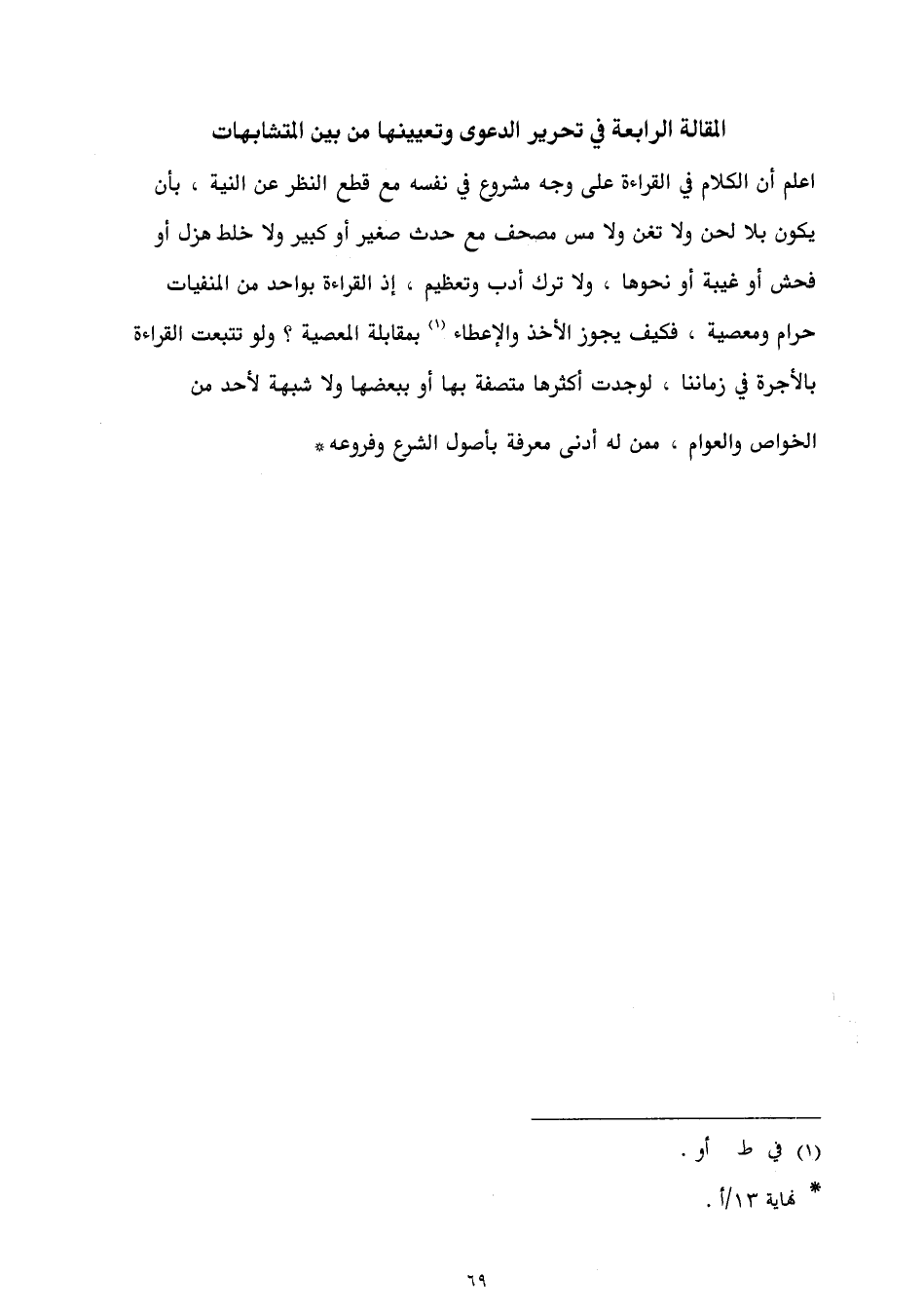 اعلم أن الكلام في القراءة على وجه مشروع في نفسه مع قطع النظر عن النية، بأن يكون بلا لحن ولا تغن ولا مس مصحف مع حدث صغير أو كبير ولا خلط هزل أو فحش أو غيبة أو نحوها، ولا ترك أدب وتعظيم، إذ القراءة بواحد من المنفيات حرام ومعصية، فكيف يجوز الأخذ والإعطاء (¬1) بمقابلة المعصية؟ ولو تتبعت القراءة بالأجرة في زماننا، لوجدت أكثرها متصفة بها أو ببعضها ولا شبهة لأحد من الخواص والعوام، ممن له أدنى معرفة بأصول الشرع وفروعه (¬2)