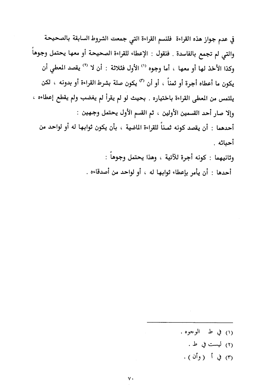 في عدم جواز هذه القراءة فلنسم القراءة التي جمعت الشروط السابقة بالصحيحة والتي لم تجمع بالفاسدة. فنقول: الإعطاء للقراءة الصحيحة أو معها يحتمل وجوهاً وكذا الأخذ لها أو معها، أما وجوه (¬1) الأول فثلاثة: أن لا (¬2) يقصد المعطي أن يكون ما أعطاه أجرة أو ثمناً، أو أن (¬3) يكون صلة بشرط القراءة أو بدونه، لكن يلتمس من المعطى القراءة باختياره. بحيث لو لم يقرأ لم يغضب ولم يقطع إعطاءه، وإلا صار أحد القسمين الأولين، ثم القسم الأول يحتمل وجهين: