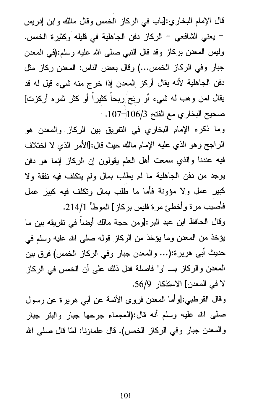 قال الإمام البخاري: [باب في الركاز الخمس وقال مالك وابن إدريس - يعني الشافعي - الركاز دفن الجاهلية في قليله وكثيرة الخمس. وليس المعدن بركاز وقد قال النبي صلى الله عليه وسلم: (في المعدن جبار وفي الركاز الخمس ... ) وقال بعض الناس: المعدن ركاز مثل دفن الجاهلية لأنه يقال أركز المعدن إذا خرج منه شيء قيل له قد يقال لمن وهب له شيء أو ربح ربحاً كثيراً أو كثر ثمره أركزت] صحيح البخاري مع الفتح 3/ 106 - 107.
