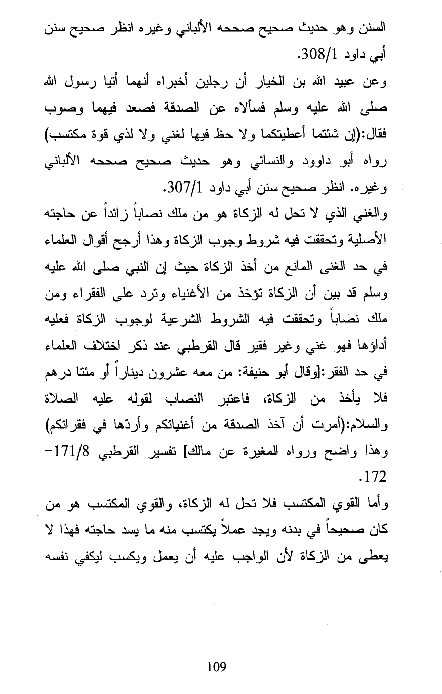 وعن عبيد الله بن الخيار أن رجلين أخبراه أنهما أتيا رسول الله صلى الله عليه وسلم فسألاه عن الصدقة فصعد فيهما وصوب فقال: (إن شئتما أعطيتكما ولا حظ فيها لغني ولا لذي قوة مكتسب) رواه أبو داوود والنسائي وهو حديث صحيح صححه الألباني وغيره. انظر صحيح سنن أبي داود 1/ 307.