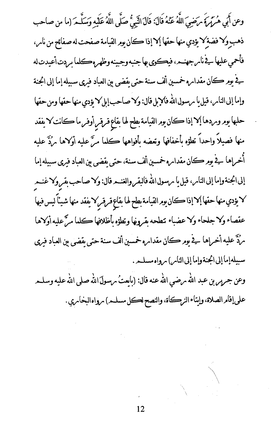 وعن أَبَي هُرَيْرَةَ رَضِيَ اللَّهُ عَنْهُ قَالَ: قَالَ النَّبِيُّ صَلَّى اللَّهُ عَلَيْهِ وَسَلَّمَ (ما من صاحب ذهبٍ ولا فضةٍ لا يؤدي منها حقها إلا إذا كان يوم القيامة صفحت له صفائح من نار، فأحمي عليها في نار جهنم، فيكوى بها جنبه وجبينه وظهره كلما بردت أعيدت له في يوم كان مقداره خمسين ألف سنة حتى يقضى بين العباد فيرى سبيله إما إلى الجنة وإما إلى النار، قيل يا رسول الله فالإبل قال: ولا صاحب إبل لا يؤدي منها حقها ومن حقها حلبها يوم وردها إلا إذا كان يوم القيامة بطح لها بقاعٍ قرقرٍ أوفر ما كانت لا يفقد منها فصيلاً واحداً تطؤه بأخفافها وتعضه بأفواهها كلما مرَّ عليه أولاها رُدَّ عليه أُخراها في يوم كان مقداره خمسين ألف سنة، حتى يقضى بين العباد فيرى سبيله إما إلى الجنة وإما إلى النار، قيل يا رسول الله فالبقر والغنم قال: ولا صاحب بقرٍ ولا غنمٍ لا يؤدي منها حقها إلا إذا كان يوم القيامة بطح لها بقاعٍ قرقرٍ لا يفقد منها شيئاً ليس فيها عقصاء ولا جلحاء ولا عضباء تنطحه بقرونها وتطؤه بأظلافها كلما مرًّ عليه أولاها رُدَّ عليه أخراها في يوم كان مقداره خمسين ألف سنة حتى يقضى بين العباد فيرى سبيله إما إلى الجنة وإما إلى النار) رواه مسلم.