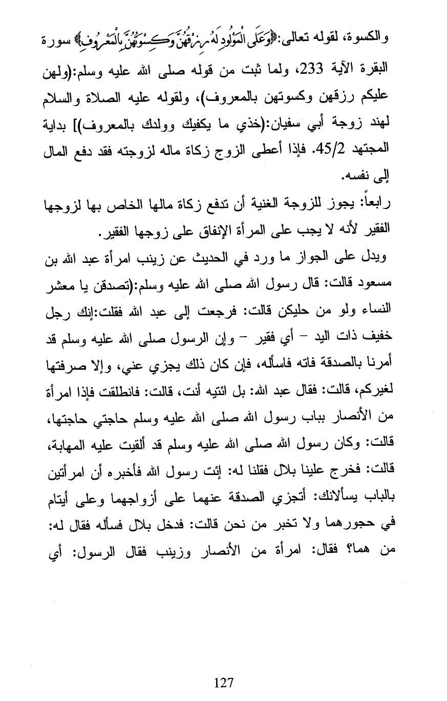 والكسوة، لقوله تعالى: (وَعَلَى الْمَوْلُودِ لَهُ رِزْقُهُنَّ وَكِسْوَتُهُنَّ بِالْمَعْرُوفِ (سورة البقرة الآية 233، ولما ثبت من قوله صلى الله عليه وسلم: (ولهن عليكم رزقهن وكسوتهن بالمعروف)، ولقوله عليه الصلاة والسلام لهند زوجة أبي سفيان: (خذي ما يكفيك وولدك بالمعروف)] بداية المجتهد 2/ 45. فإذا أعطى الزوج زكاة ماله لزوجته فقد دفع المال إلى نفسه.