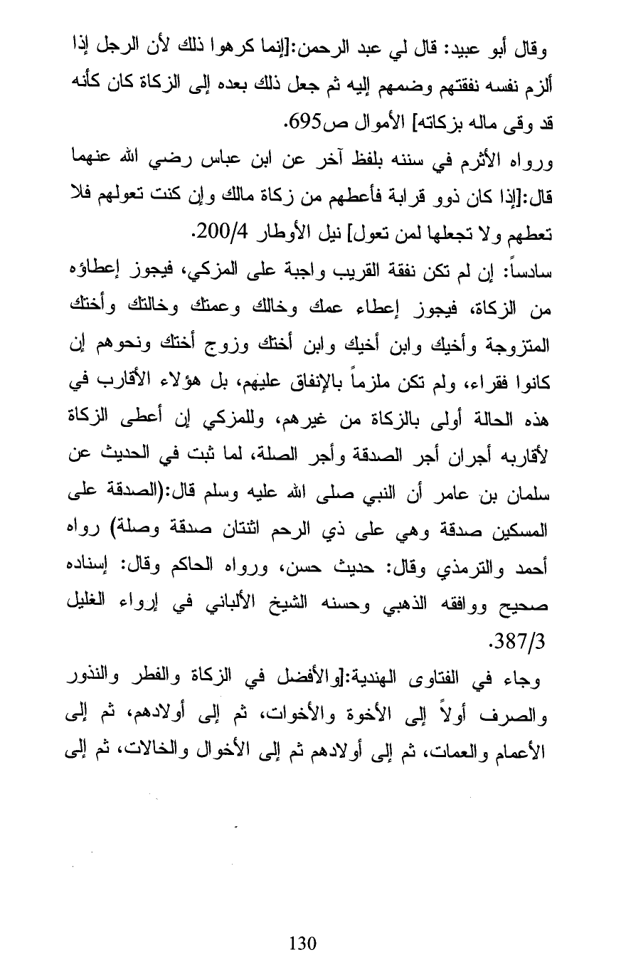 ورواه الأثرم في سننه بلفظ آخر عن ابن عباس رضي الله عنهما قال: [إذا كان ذوو قرابة فأعطهم من زكاة مالك وإن كنت تعولهم فلا تعطهم ولا تجعلها لمن تعول] نيل الأوطار 4/ 200.