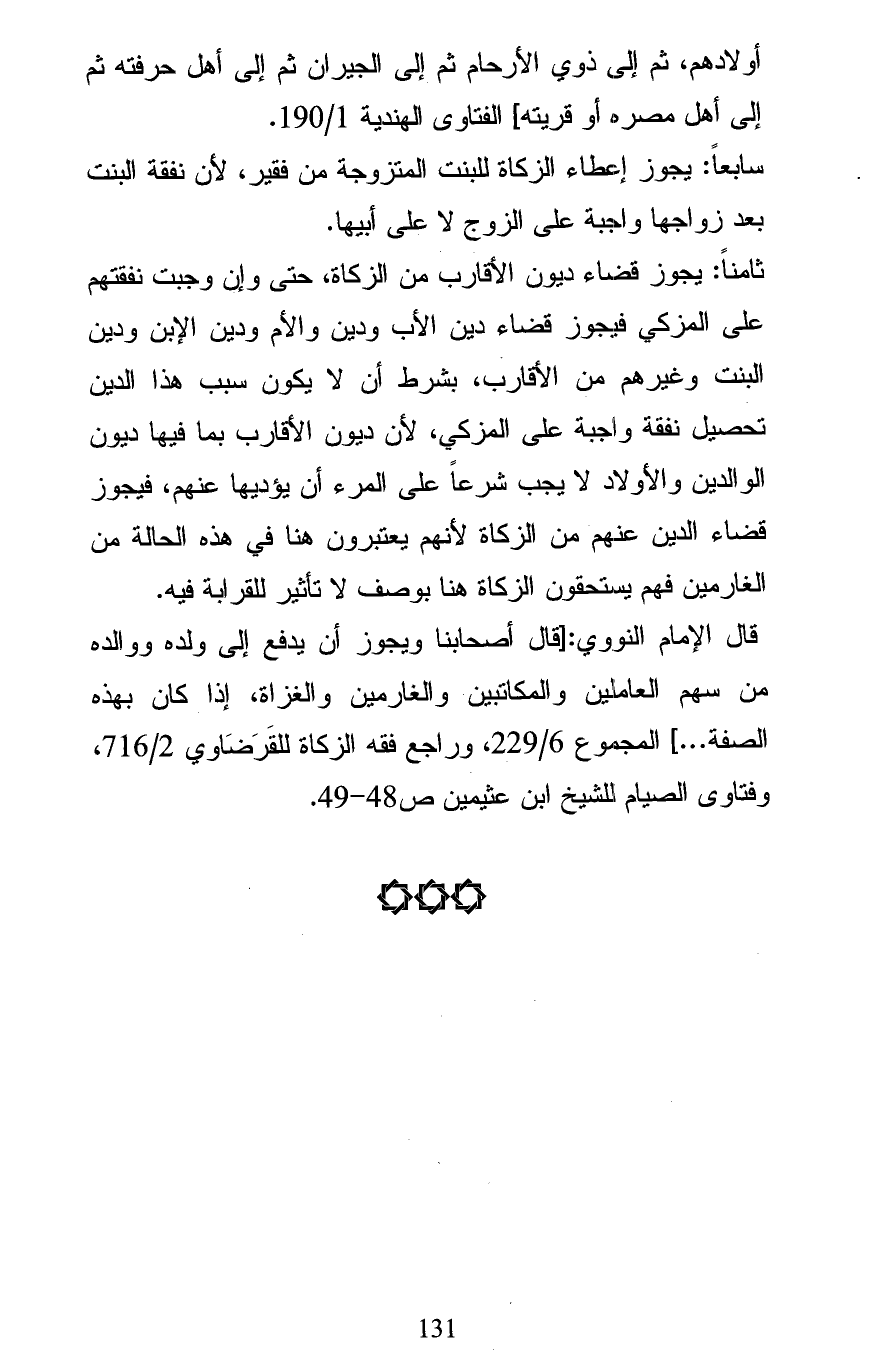 ثامناً: يجوز قضاء ديون الأقارب من الزكاة، حتى وإن وجبت نفقتهم على المزكي فيجوز قضاء دين الأب ودين والأم ودين الإبن ودين البنت وغيرهم من الأقارب، بشرط أن لا يكون سبب هذا الدين تحصيل نفقة واجبة على المزكي، لأن ديون الأقارب بما فيها ديون الوالدين والأولاد لا يجب شرعاً على المرء أن يؤديها عنهم، فيجوز قضاء الدين عنهم من الزكاة لأنهم يعتبرون هنا في هذه الحالة من الغارمين فهم يستحقون الزكاة هنا بوصف لا تأثير للقرابة فيه.