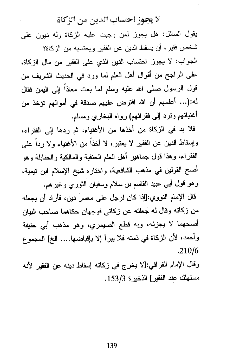 وقال الإمام القرافي: [لا يخرج في زكاته إسقاط دينه عن الفقير لأنه مستهلك عند الفقير] الذخيرة 3/ 153.