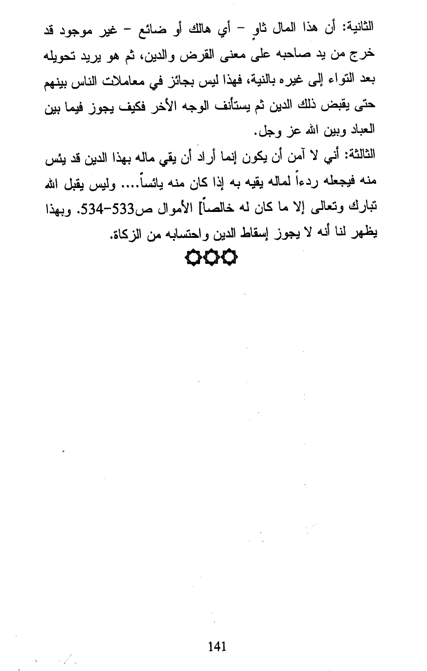 الثانية: أن هذا المال ثاوٍ - أي هالك أو ضائع - غير موجود قد خرج من يد صاحبه على معنى القرض والدين، ثم هو يريد تحويله بعد التواء إلى غيره بالنية، فهذا ليس بجائز في معاملات الناس بينهم حتى يقبض ذلك الدين ثم يستأنف الوجه الأخر فكيف يجوز فيما بين العباد وبين الله عز وجل.