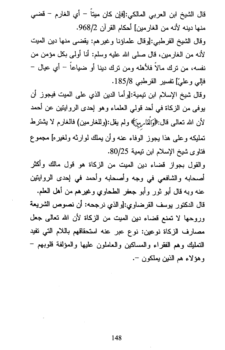 قال الدكتور يوسف القرضاوي: [والذي نرجحه: أن نصوص الشريعة وروحها لا تمنع قضاء دين الميت من الزكاة لأن الله تعالى جعل مصارف الزكاة نوعين: نوع عبر عنه استحقاقهم باللام التي تفيد التمليك وهم الفقراء والمساكين والعاملون عليها والمؤلفة قلوبهم - وهؤلاء هم الذين يملكون -.