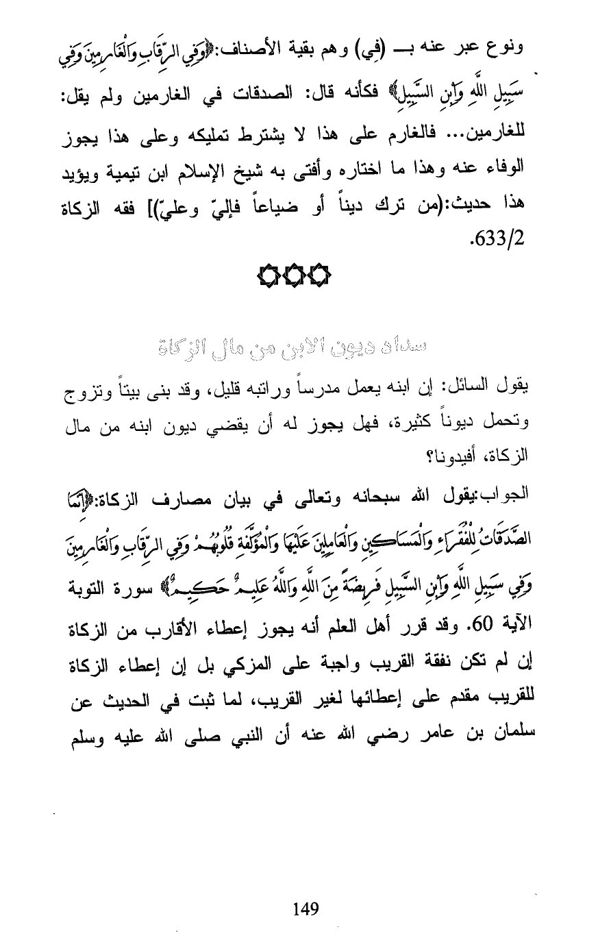 ونوع عبر عنه بـ (فِي) وهم بقية الأصناف: (وَفِي الرِّقَابِ وَالْغَارِمِينَ وَفِي سَبِيلِ اللَّهِ وَاِبْنِ السَّبِيلِ (فكأنه قال: الصدقات في الغارمين ولم يقل: للغارمين ... فالغارم على هذا لا يشترط تمليكه وعلى هذا يجوز الوفاء عنه وهذا ما اختاره وأفتى به شيخ الإسلام ابن تيمية ويؤيد هذا حديث: (من ترك ديناً أو ضياعاً فإليّ وعليّ)] فقه الزكاة 2/ 633.