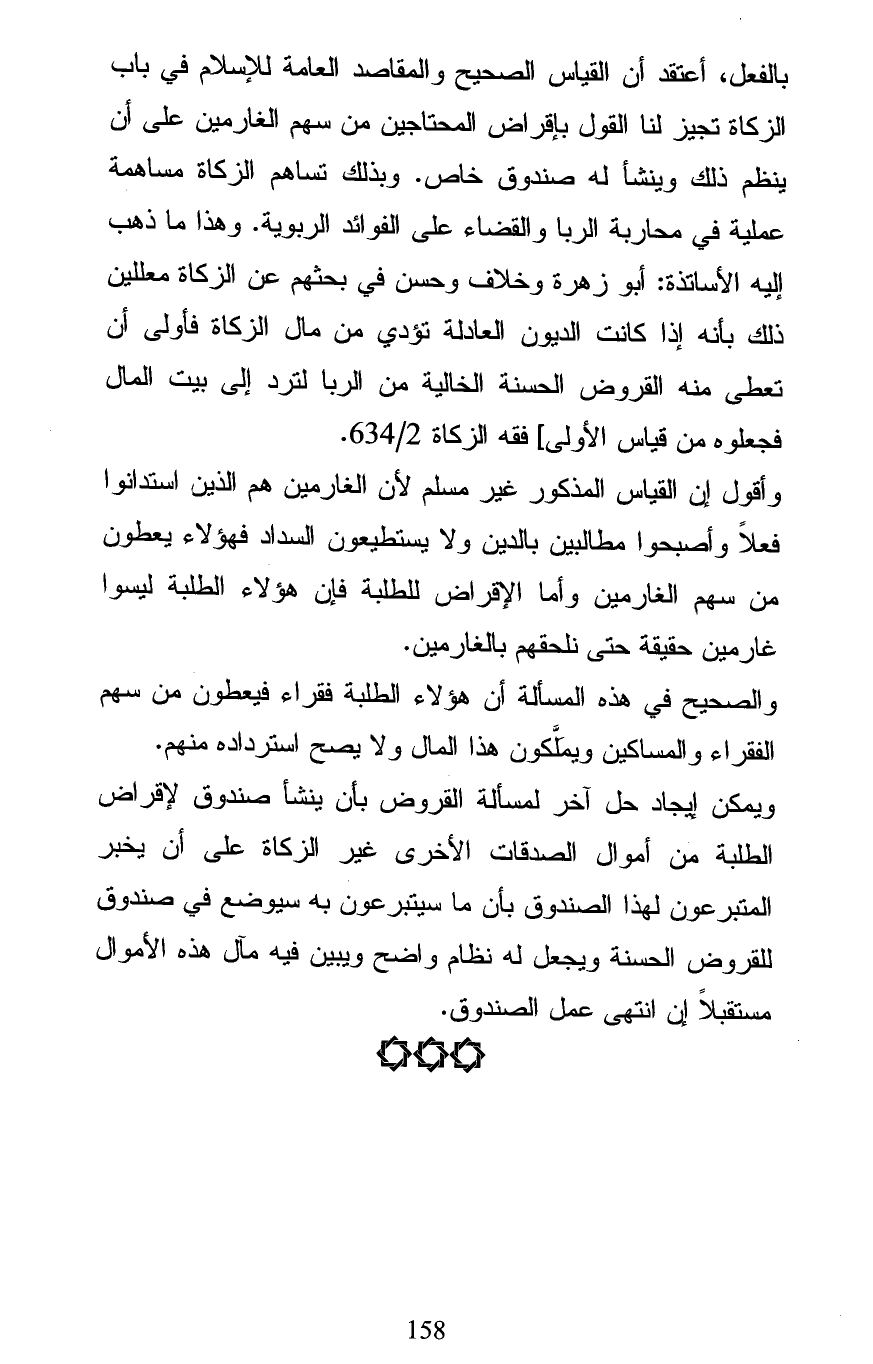 بالفعل، أعتقد أن القياس الصحيح والمقاصد العامة للإسلام في باب الزكاة تجيز لنا القول بإقراض المحتاجين من سهم الغارمين على أن ينظم ذلك وينشأ له صندوق خاص. وبذلك تساهم الزكاة مساهمة عملية في محاربة الربا والقضاء على الفوائد الربوية. وهذا ما ذهب إليه الأساتذة: أبو زهرة وخلاف وحسن في بحثهم عن الزكاة معللين ذلك بأنه إذا كانت الديون العادلة تؤدي من مال الزكاة فأولى أن تعطى منه القروض الحسنة الخالية من الربا لترد إلى بيت المال فجعلوه من قياس الأولى] فقه الزكاة 2/ 634.