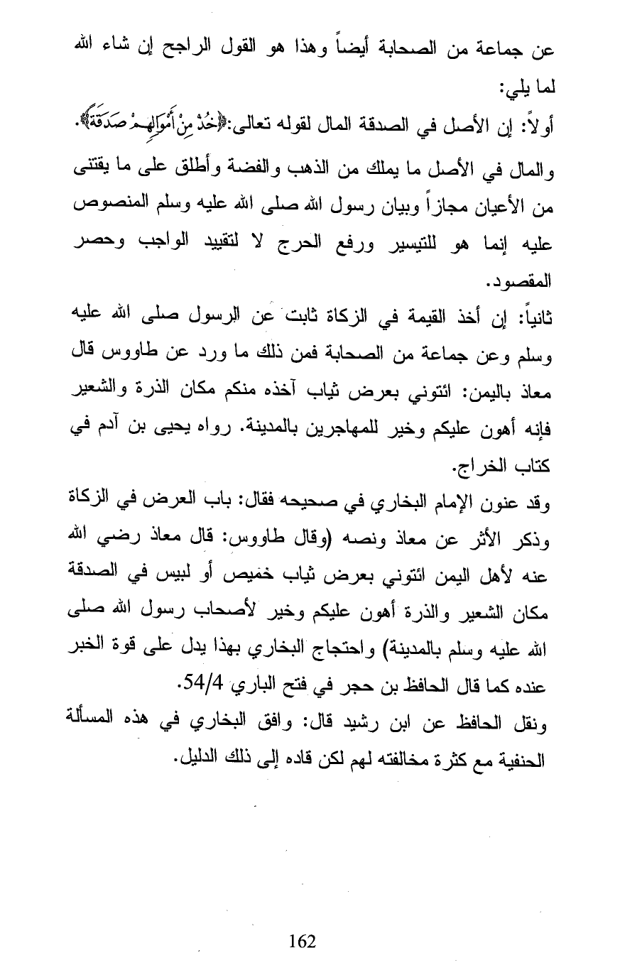 ثانياً: إن أخذ القيمة في الزكاة ثابت عن الرسول صلى الله عليه وسلم وعن جماعة من الصحابة فمن ذلك ما ورد عن طاووس قال معاذ باليمن: ائتوني بعرض ثياب آخذه منكم مكان الذرة والشعير فإنه أهون عليكم وخير للمهاجرين بالمدينة. رواه يحيى بن آدم في كتاب الخراج.