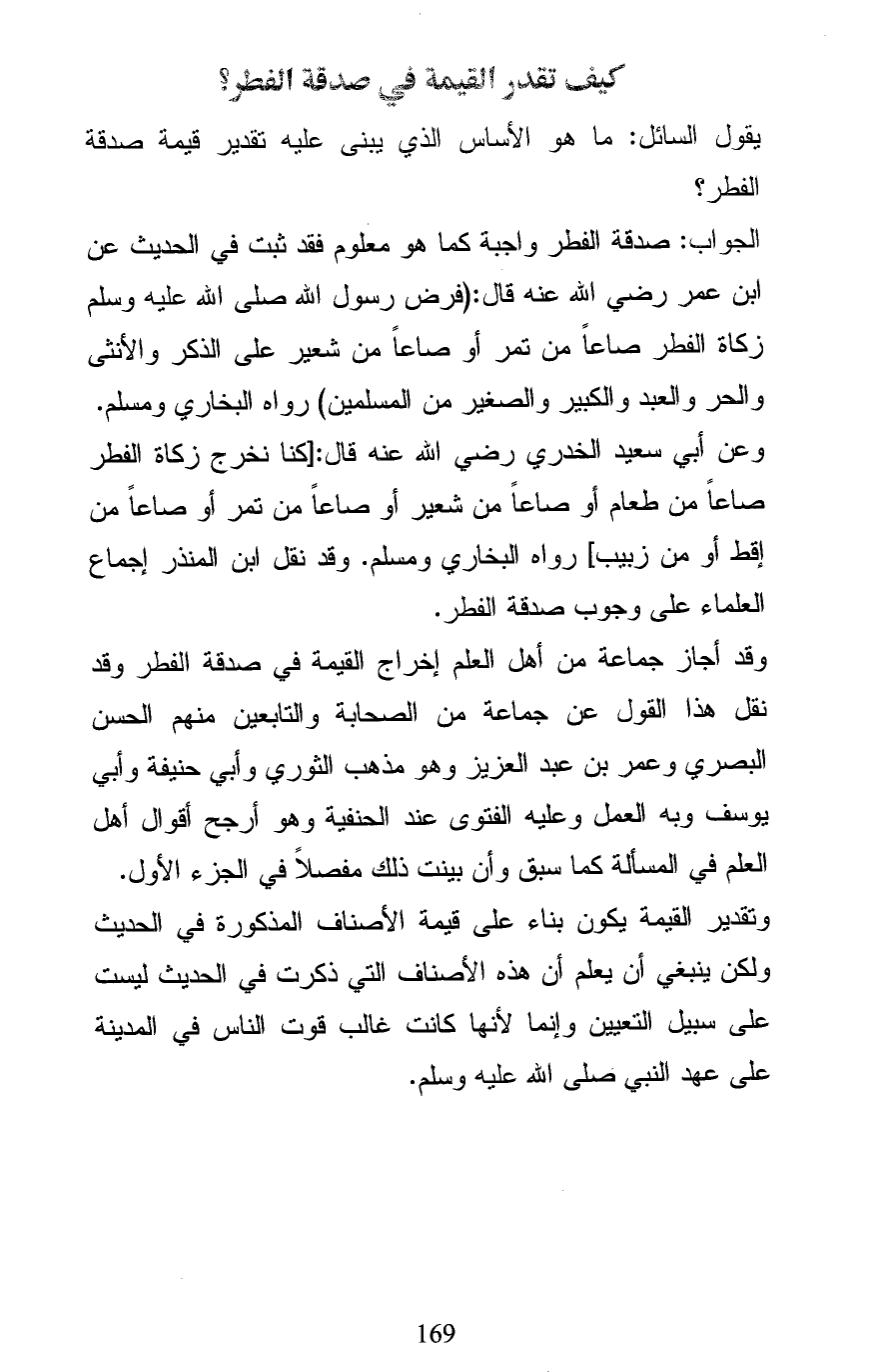 وتقدير القيمة يكون بناء على قيمة الأصناف المذكورة في الحديث ولكن ينبغي أن يعلم أن هذه الأصناف التي ذكرت في الحديث ليست على سبيل التعيين وإنما لأنها كانت غالب قوت الناس في المدينة على عهد النبي صلى الله عليه وسلم.
