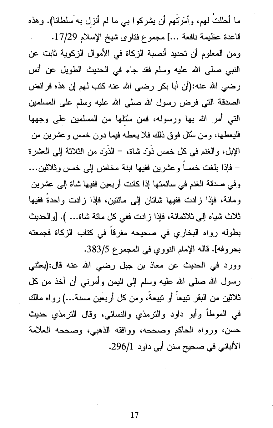 ومن المعلوم أن تحديد أنصبة الزكاة في الأموال الزكوية ثابت عن النبي صلى الله عليه وسلم فقد جاء في الحديث الطويل عن أنس رضي الله عنه: (أن أبا بكر رضي الله عنه كتب لهم إن هذه فرائض الصدقة التي فرض رسول الله صلى الله عليه وسلم على المسلمين التي أمر الله بها ورسوله، فمن سُئِلها من المسلمين على وجهها فليعطها، ومن سُئل فوق ذلك فلا يعطه فيما دون خمس وعشرين من الإبل، والغنم في كل خمس ذَوْد شاة، - الذَوْد من الثلاثة إلى العشرة - فإذا بلغت خمساً وعشرين ففيها ابنة مخاض إلى خمس وثلاثين ... وفي صدقة الغنم في سائمتها إذا كانت أربعين ففيها شاة إلى عشرين ومائة، فإذا زادت ففيها شاتان إلى مائتين، فإذا زادت واحدةً ففيها ثلاث شياه إلى ثلاثمائة، فإذا زادت ففي كل مائة شاة ... ). [والحديث بطوله رواه البخاري في صحيحه مفرقاً في كتاب الزكاة فجمعته بحروفه]. قاله الإمام النووي في المجموع 5/ 383.