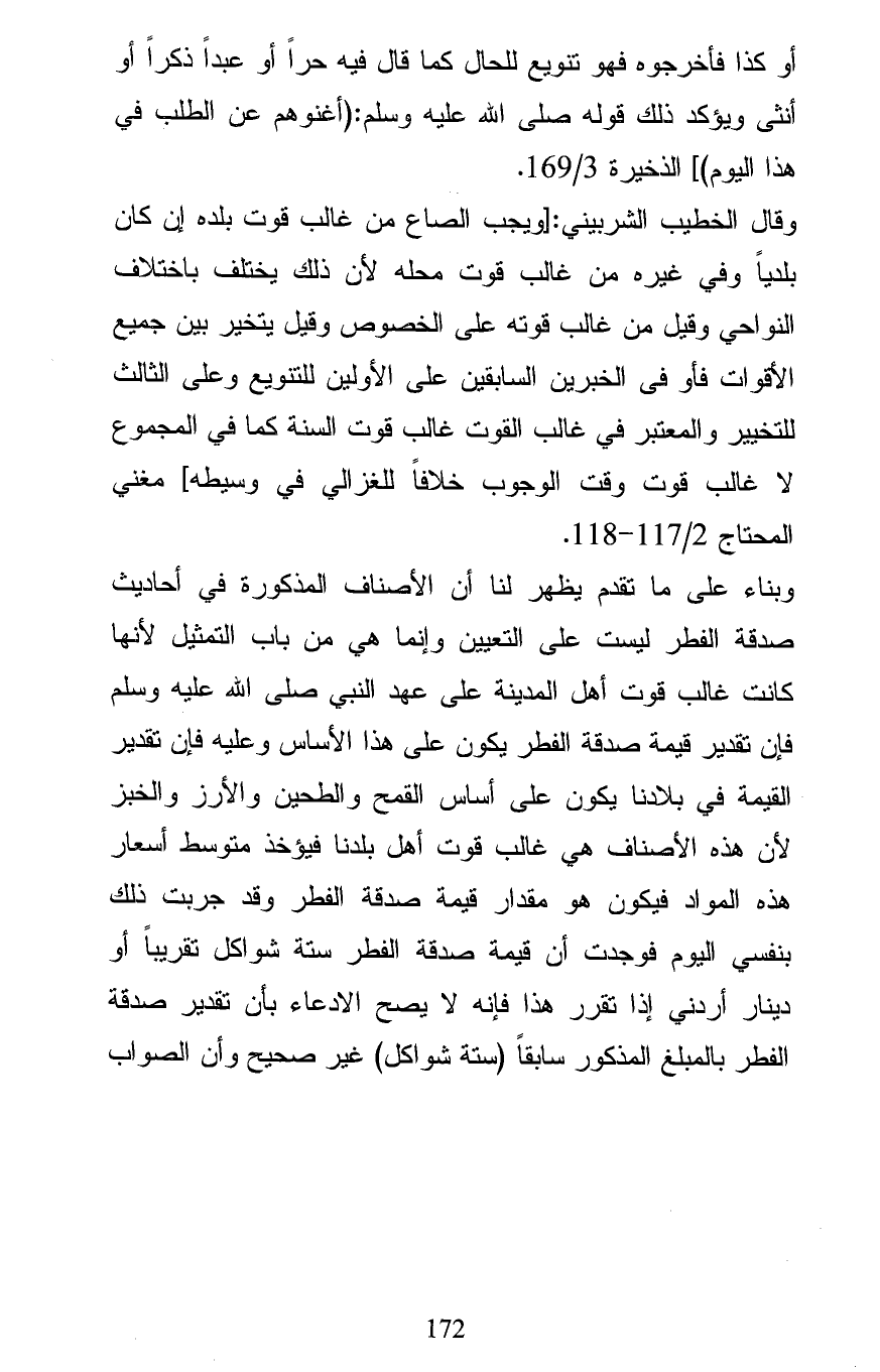 وبناء على ما تقدم يظهر لنا أن الأصناف المذكورة في أحاديث صدقة الفطر ليست على التعيين وإنما هي من باب التمثيل لأنها كانت غالب قوت أهل المدينة على عهد النبي صلى الله عليه وسلم فإن تقدير قيمة صدقة الفطر يكون على هذا الأساس وعليه فإن تقدير القيمة في بلادنا يكون على أساس القمح والطحين والأرز والخبز لأن هذه الأصناف هي غالب قوت أهل بلدنا فيؤخذ متوسط أسعار هذه المواد فيكون هو مقدار قيمة صدقة الفطر وقد جربت ذلك بنفسي اليوم فوجدت أن قيمة صدقة الفطر ستة شواكل تقريباً أو دينار أردني إذا تقرر هذا فإنه لا يصح الادعاء بأن تقدير صدقة الفطر بالمبلغ المذكور سابقاً (ستة شواكل) غير صحيح وأن الصواب