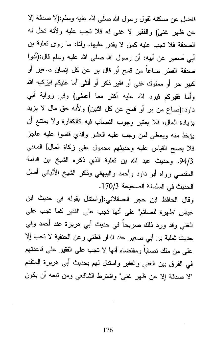 فاضل عن مسكنه لقول رسول الله صلى الله عليه وسلم: (لا صدقة إلا عن ظهر غنىً) والفقير لا غنى له فلا تجب عليه ولأنه تحل له الصدقة فلا تجب عليه كمن لا يقدر عليها. ولنا: ما روى ثعلبة بن أبي صعير عن أبيه: أن رسول الله صلى الله عليه وسلم قال: (أدوا صدقة الفطر صاعاً من قمح أو قال بر عن كل إنسان صغير أو كبير حر أو مملوك غني أو فقير ذكر أو أنثى أما غنيكم فيزكيه الله وأما فقيركم فيرد الله عليه أكثر مما أعطى) وفي رواية أبي داود: (صاع من بر أو قمح عن كل اثنين) ولأنه حق مال لا يزيد بزيادة المال، فلا يعتبر وجوب النصاب فيه كالكفارة ولا يمتنع أن يؤخذ منه ويعطى لمن وجب عليه العشر والذي قاسوا عليه عاجز فلا يصح القياس عليه وحديثهم محمول على زكاة المال] المغني 3/ 94. وحديث عبد الله بن ثعلبة الذي ذكره الشيخ ابن قدامة المقدسي رواه أبو داود وأحمد والبيهقي وذكر الشيخ الألباني أصل الحديث في السلسلة الصحيحة 3/ 170.