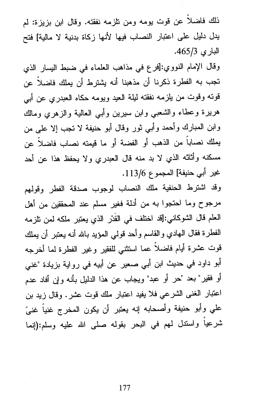 وقال الإمام النووي: [فرع في مذاهب العلماء في ضبط اليسار الذي تجب به الفطرة ذكرنا أن مذهبنا أنه يشترط أن يملك فاضلاً عن قوته وقوت من يلزمه نفقته ليلة العيد ويومه حكاه العبدري عن أبي هريرة وعطاء والشعبي وابن سيرين وأبي العالية والزهري ومالك وابن المبارك وأحمد وأبي ثور وقال أبو حنيفة لا تجب إلا على من يملك نصاباً من الذهب أو الفضة أو ما قيمته نصاب فاضلاً عن مسكنه وأثاثه الذي لا بد منه قال العبدري ولا يحفظ هذا عن أحد غير أبي حنيفة] المجموع 6/ 113.
