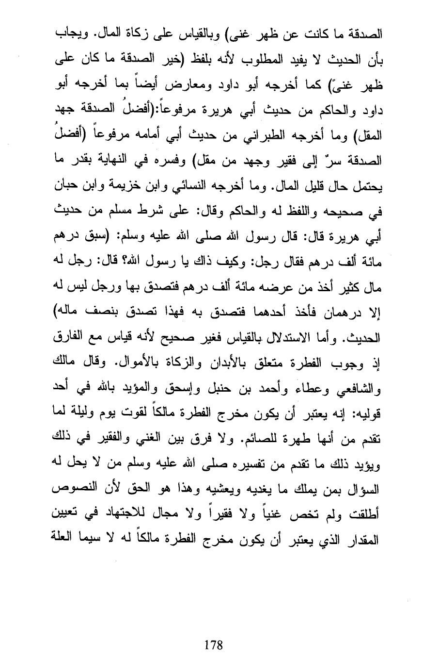 الصدقة ما كانت عن ظهر غنى) وبالقياس على زكاة المال. ويجاب بأن الحديث لا يفيد المطلوب لأنه بلفظ (خير الصدقة ما كان على ظهر غنىً) كما أخرجه أبو داود ومعارض أيضاً بما أخرجه أبو داود والحاكم من حديث أبي هريرة مرفوعاً: (أفضلُ الصدقة جهد المقل) وما أخرجه الطبراني من حديث أبي أمامه مرفوعاً (أفضلُ الصدقة سرٌ إلى فقير وجهد من مقل) وفسره في النهاية بقدر ما يحتمل حال قليل المال. وما أخرجه النسائي وابن خزيمة وابن حبان في صحيحه واللفظ له والحاكم وقال: على شرط مسلم من حديث أبي هريرة قال: قال رسول الله صلى الله عليه وسلم: (سبق درهم مائة ألف درهم فقال رجل: وكيف ذاك يا رسول الله؟ قال: رجل له مال كثير أخذ من عرضه مائة ألف درهم فتصدق بها ورجل ليس له إلا درهمان فأخذ أحدهما فتصدق به فهذا تصدق بنصف ماله) الحديث. وأما الاستدلال بالقياس فغير صحيح لأنه قياس مع الفارق إذ وجوب الفطرة متعلق بالأبدان والزكاة بالأموال. وقال مالك والشافعي وعطاء وأحمد بن حنبل وإسحق والمؤيد بالله في أحد قوليه: إنه يعتبر أن يكون مخرج الفطرة مالكاً لقوت يوم وليلة لما تقدم من أنها طهرة للصائم.