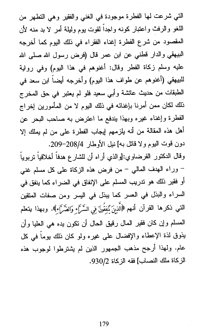 وقال الدكتور القرضاوي: [والذي أراه أن للشارع هدفاً أخلاقياً تربوياً - وراء الهدف المالي - من فرض هذه الزكاة على كل مسلم غني أو فقير ذلك هو تدريب المسلم على الإنفاق في الضراء كما ينفق في السراء والبذل في العسر كما يبذل في اليسر ومن صفات المتقين التي ذكرها القرآن أنهم (الَّذِينَ يُنْفِقُونَ فِي السَّرَّاءِ وَالضَّرَّاءِ (. وبهذا يتعلم المسلم وإن كان فقير المال رقيق الحال أن تكون يده هي العليا وأن يذوق لذة الإعطاء والإفضال على غيره ولو كان ذلك يوماً في كل عام. ولهذا أرجح مذهب الجمهور الذين لم يشترطوا لوجوب هذه الزكاة ملك النصاب] فقه الزكاة 2/ 930.