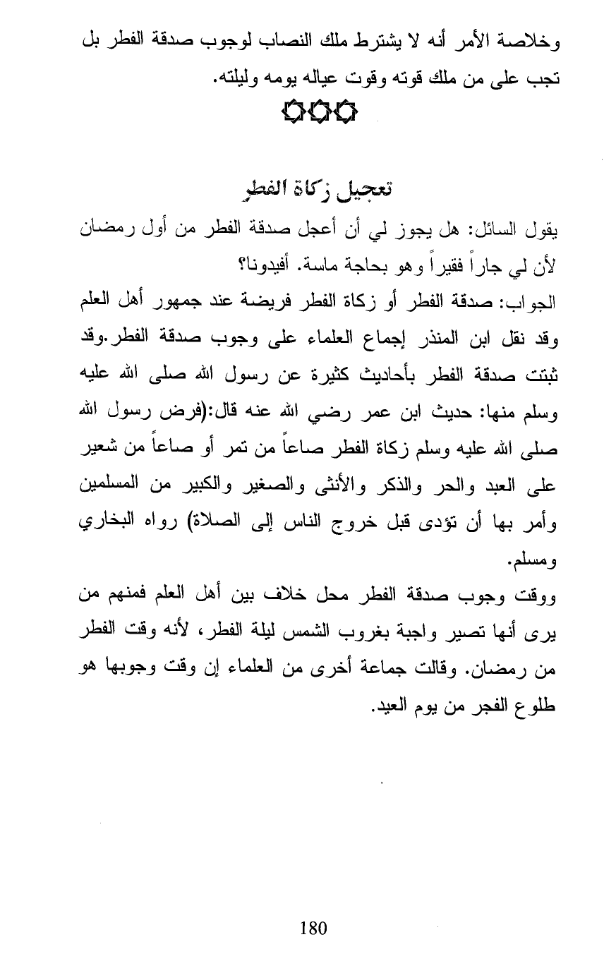 وخلاصة الأمر أنه لا يشترط ملك النصاب لوجوب صدقة الفطر بل تجب على من ملك قوته وقوت عياله يومه وليلته.