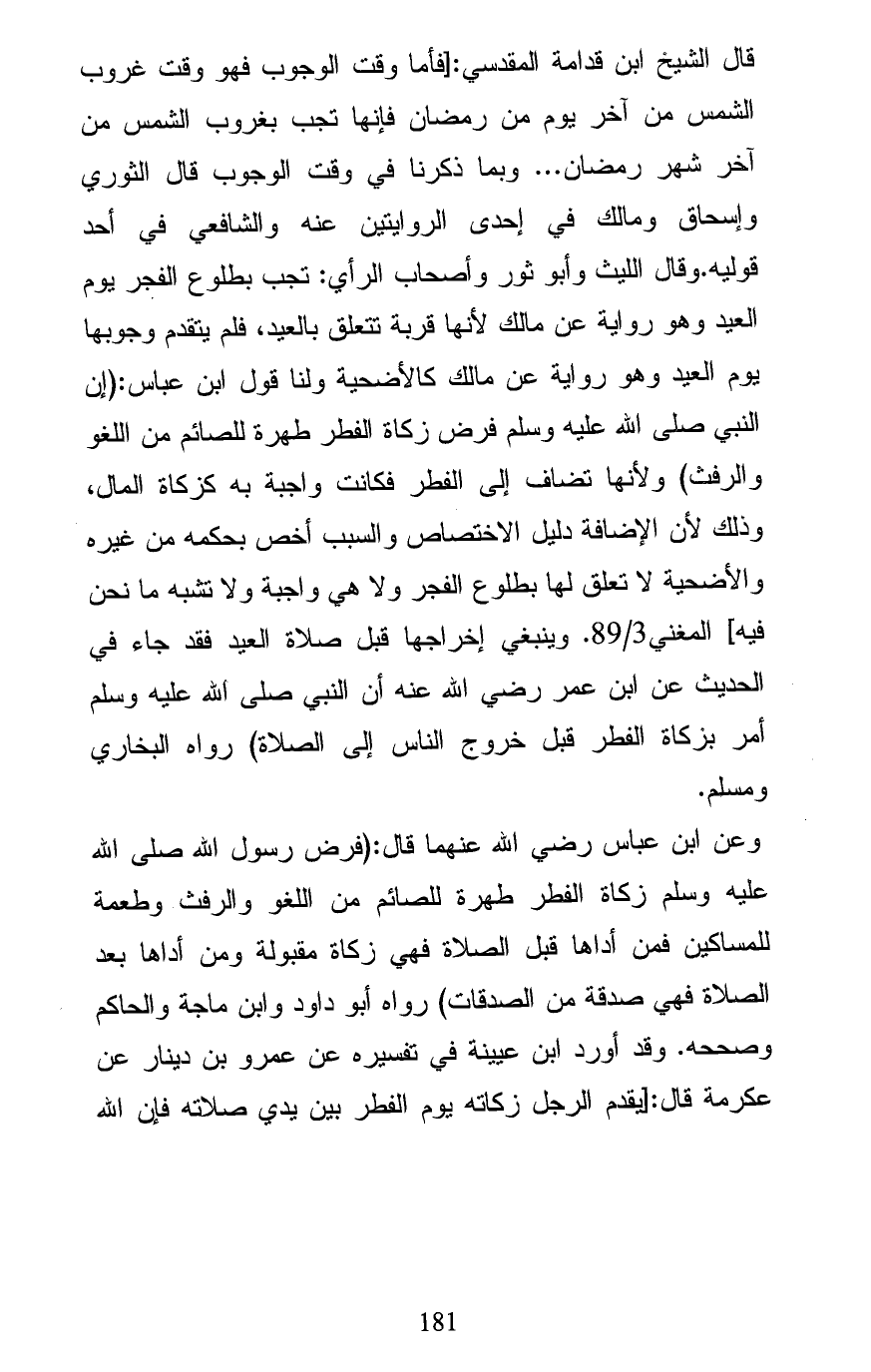 وعن ابن عباس رضي الله عنهما قال: (فرض رسول الله صلى الله عليه وسلم زكاة الفطر طهرة للصائم من اللغو والرفث وطعمة للمساكين فمن أداها قبل الصلاة فهي زكاة مقبولة ومن أداها بعد الصلاة فهي صدقة من الصدقات) رواه أبو داود وابن ماجة والحاكم وصححه. وقد أورد ابن عيينة في تفسيره عن عمرو بن دينار عن عكرمة قال: [يقدم الرجل زكاته يوم الفطر بين يدي صلاته فإن الله