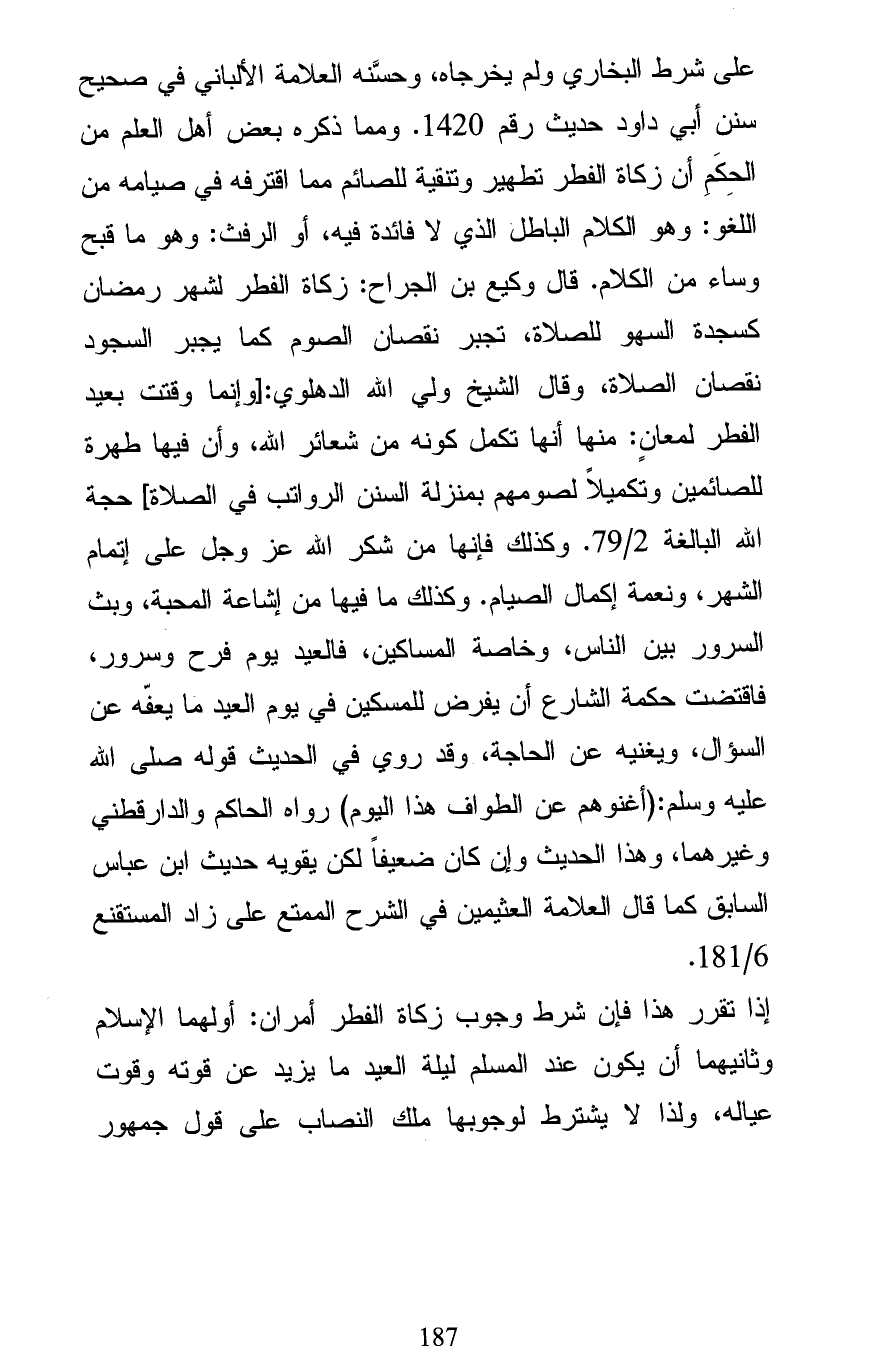 على شرط البخاري ولم يخرجاه، وحسَّنه العلامة الألباني في صحيح سنن أبي داود حديث رقم 1420. ومما ذكره بعض أهل العلم من الحِكَمِ أن زكاة الفطر تطهير وتنقية للصائم مما اقترفه في صيامه من اللغو: وهو الكلام الباطل الذي لا فائدة فيه، أو الرفث: وهو ما قبح وساء من الكلام. قال وكيع بن الجراح: زكاة الفطر لشهر رمضان كسجدة السهو للصلاة، تجبر نقصان الصوم كما يجبر السجود نقصان الصلاة، وقال الشيخ ولي الله الدهلوي: [وإنما وقتت بعيد الفطر لمعانٍ: منها أنها تكمل كونه من شعائر الله، وأن فيها طهرة للصائمين وتكميلاً لصومهم بمنزلة السنن الرواتب في الصلاة] حجة الله البالغة 2/ 79. وكذلك فإنها من شكر الله عز وجل على إتمام الشهر، ونعمة إكمال الصيام. وكذلك ما فيها من إشاعة المحبة، وبث السرور بين الناس، وخاصة المساكين، فالعيد يوم فرح وسرور، فاقتضت حكمة الشارع أن يفرض للمسكين في يوم العيد ما يعفّه عن السؤال، ويغنيه عن الحاجة، وقد روي في الحديث قوله صلى الله عليه وسلم: (أغنوهم عن الطواف هذا اليوم) رواه الحاكم والدارقطني وغيرهما، وهذا الحديث وإن كان ضعيفاً لكن يقويه حديث ابن عباس السابق كما قال العلامة العثيمين في الشرح الممتع على زاد المستقنع 6/ 181.