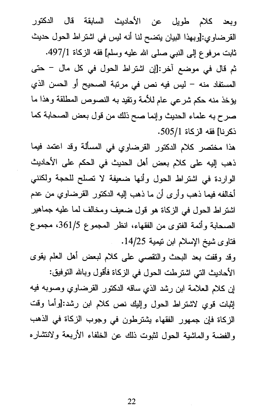 وبعد كلام طويل عن الأحاديث السابقة قال الدكتور القرضاوي: [وبهذا البيان يتضح لنا أنه ليس في اشتراط الحول حديث ثابت مرفوع إلى النبي صلى الله عليه وسلم] فقه الزكاة 1/ 497.