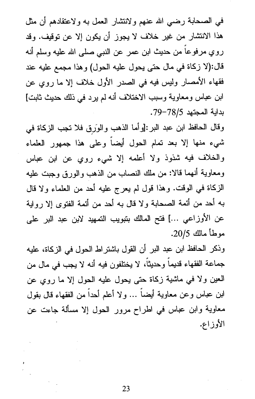وذكر الحافظ ابن عبد البر أن القول باشتراط الحول في الزكاة، عليه جماعة الفقهاء قديماً وحديثاً، لا يختلفون فيه أنه لا يجب في مال من العين ولا في ماشية زكاة حتى يحول عليه الحول إلا ما روي عن ابن عباس وعن معاوية أيضاً ... ولا أعلم أحداً من الفقهاء قال بقول معاوية وابن عباس في اطراح مرور الحول إلا مسألة جاءت عن الأوزاع.