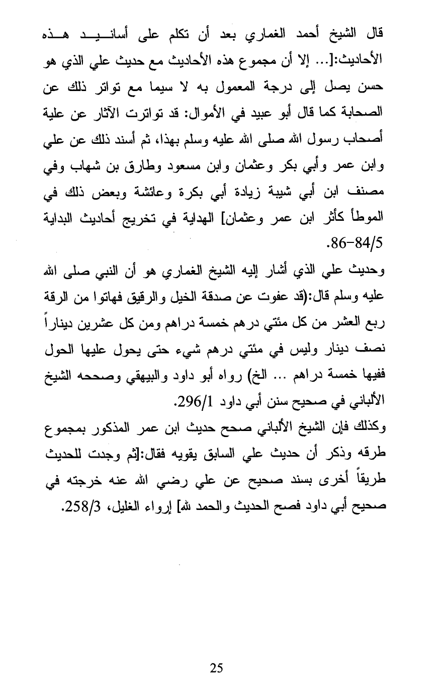 وحديث علي الذي أشار إليه الشيخ الغماري هو أن النبي صلى الله عليه وسلم قال: (قد عفوت عن صدقة الخيل والرقيق فهاتوا من الرقة ربع العشر من كل مئتي درهم خمسة دراهم ومن كل عشرين ديناراً نصف دينار وليس في مئتي درهم شيء حتى يحول عليها الحول ففيها خمسة دراهم ... الخ) رواه أبو داود والبيهقي وصححه الشيخ الألباني في صحيح سنن أبي داود 1/ 296.