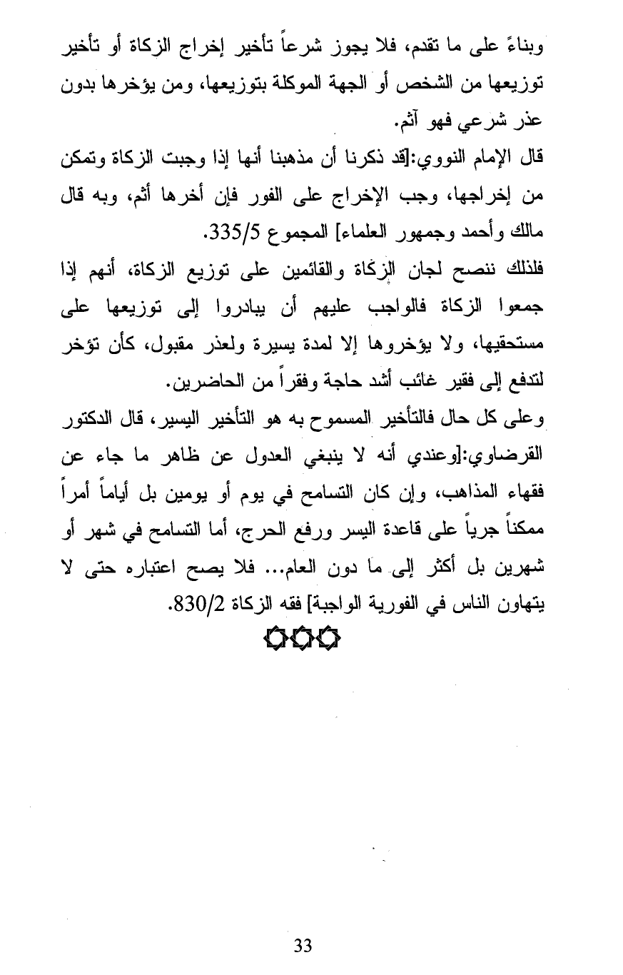 فلذلك ننصح لجان الزكاة والقائمين على توزيع الزكاة، أنهم إذا جمعوا الزكاة فالواجب عليهم أن يبادروا إلى توزيعها على مستحقيها، ولا يؤخروها إلا لمدة يسيرة ولعذر مقبول، كأن تؤخر لتدفع إلى فقير غائب أشد حاجة وفقراً من الحاضرين.