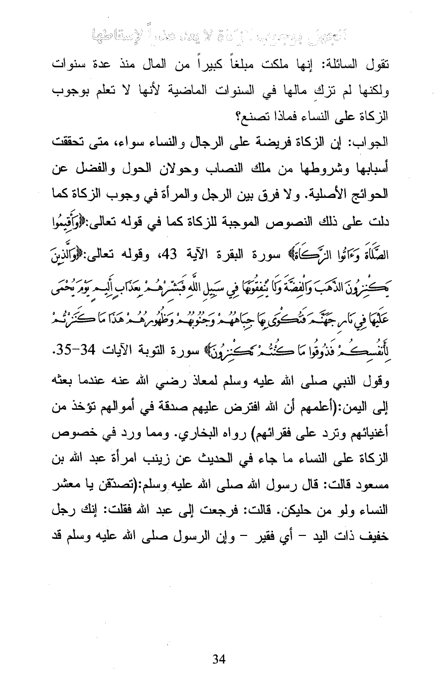 الجواب: إن الزكاة فريضة على الرجال والنساء سواء، متى تحققت أسبابها وشروطها من ملك النصاب وحولان الحول والفضل عن الحوائج الأصلية. ولا فرق بين الرجل والمرأة في وجوب الزكاة كما دلت على ذلك النصوص الموجبة للزكاة كما في قوله تعالى: (وَأَقِيمُوا الصَّلَاةَ وَءَاتُوا الزَّكَاةَ (سورة البقرة الآية 43، وقوله تعالى: (وَالَّذِينَ يَكْنِزُونَ الذَّهَبَ وَالْفِضَّةَ وَلَا يُنْفِقُونَهَا فِي سَبِيلِ اللَّهِ فَبَشِّرْهُمْ بِعَذَابٍ أَلِيمٍ يَوْمَ يُحْمَى عَلَيْهَا فِي نَارِ جَهَنَّمَ فَتُكْوَى بِهَا جِبَاهُهُمْ وَجُنُوبُهُمْ وَظُهُورُهُمْ هَذَا مَا كَنَزْتُمْ لِأَنْفُسِكُمْ فَذُوقُوا مَا كُنْتُمْ تَكْنِزُونَ (سورة التوبة الآيات 34 - 35. وقول النبي صلى الله عليه وسلم لمعاذ رضي الله عنه عندما بعثه إلى اليمن: (أعلمهم أن الله افترض عليهم صدقة في أموالهم تؤخذ من أغنيائهم وترد على فقرائهم) رواه البخاري. ومما ورد في خصوص الزكاة على النساء ما جاء في الحديث عن زينب امرأة عبد الله بن مسعود قالت: قال رسول الله صلى الله عليه وسلم: (تصدّقن يا معشر النساء ولو من حليكن. قالت: فرجعت إلى عبد الله فقلت: إنك رجل خفيف ذات اليد - أي فقير - وإن الرسول صلى الله عليه وسلم قد