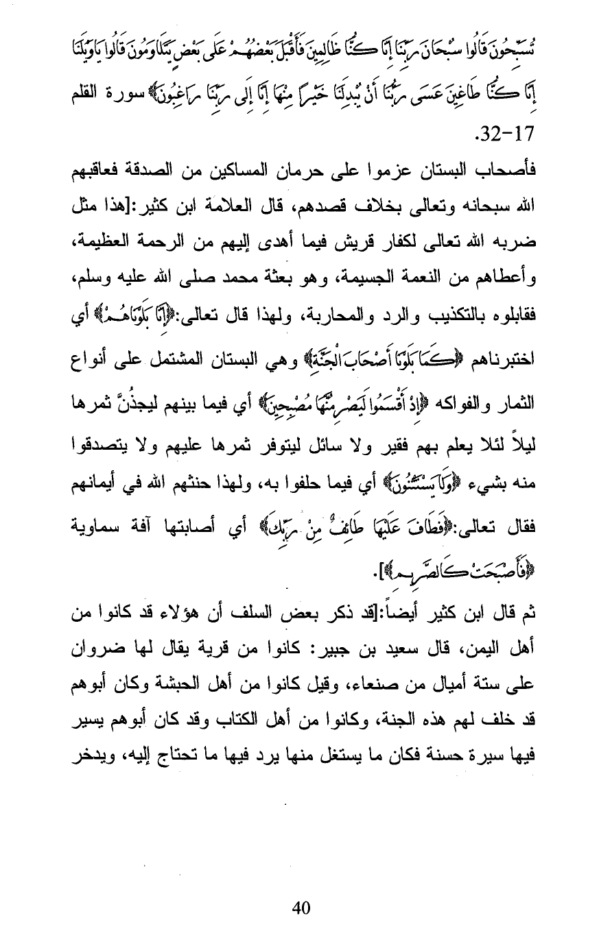 تُسَبِّحُونَ قَالُوا سُبْحَانَ رَبِّنَا إِنَّا كُنَّا ظَالِمِينَ فَأَقْبَلَ بَعْضُهُمْ عَلَى بَعْضٍ يَتَلَاوَمُونَ قَالُوا يَاوَيْلَنَا إِنَّا كُنَّا طَاغِينَ عَسَى رَبُّنَا أَنْ يُبْدِلَنَا خَيْرًا مِنْهَا إِنَّا إِلَى رَبِّنَا رَاغِبُونَ (سورة القلم 17 - 32.