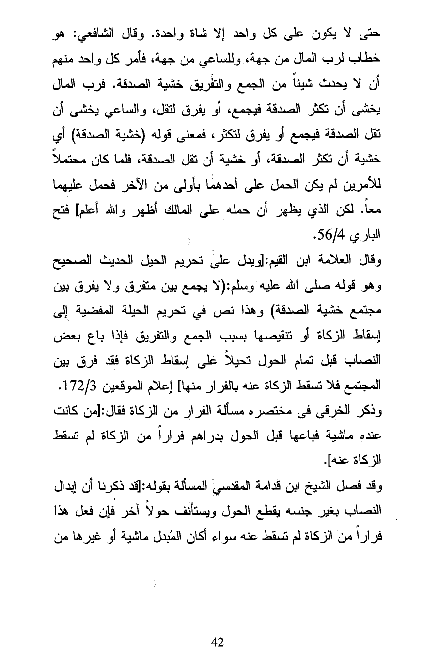 وقال العلامة ابن القيم: [ويدل على تحريم الحيل الحديث الصحيح وهو قوله صلى الله عليه وسلم: (لا يجمع بين متفرق ولا يفرق بين مجتمع خشية الصدقة) وهذا نص في تحريم الحيلة المفضية إلى إسقاط الزكاة أو تنقيصها بسبب الجمع والتفريق فإذا باع بعض النصاب قبل تمام الحول تحيلاً على إسقاط الزكاة فقد فرق بين المجتمع فلا تسقط الزكاة عنه بالفرار منها] إعلام الموقعين 3/ 172.