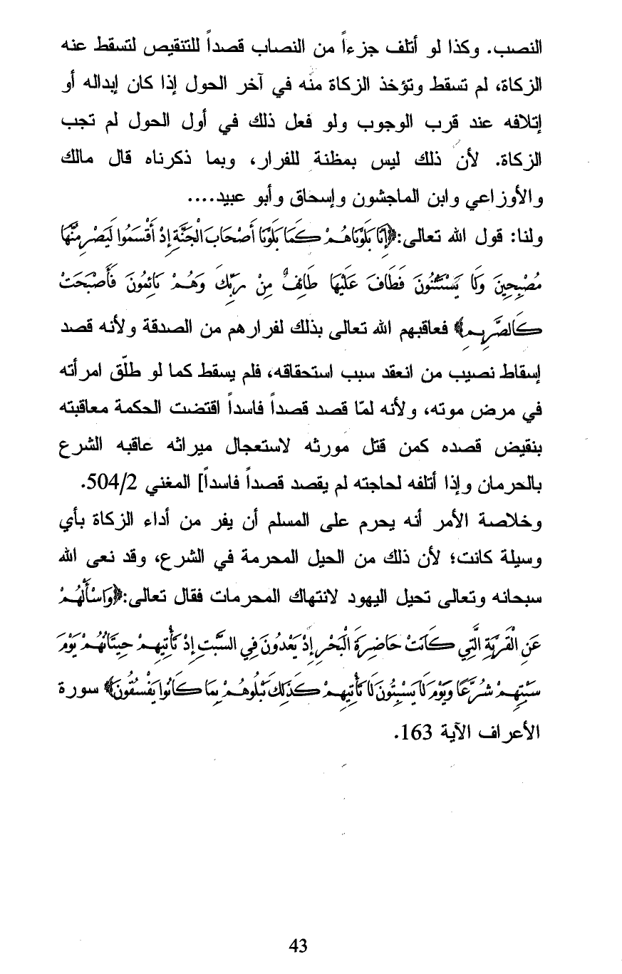 ولنا: قول الله تعالى: (إِنَّا بَلَوْنَاهُمْ كَمَا بَلَوْنَا أَصْحَابَ الْجَنَّةِ إِذْ أَقْسَمُوا لَيَصْرِمُنَّهَا مُصْبِحِينَ وَلَا يَسْتَثْنُونَ فَطَافَ عَلَيْهَا طَائِفٌ مِنْ رَبِّكَ وَهُمْ نَائِمُونَ فَأَصْبَحَتْ كَالصَّرِيمِ (فعاقبهم الله تعالى بذلك لفرارهم من الصدقة ولأنه قصد إسقاط نصيب من انعقد سبب استحقاقه، فلم يسقط كما لو طلّق امرأته في مرض موته، ولأنه لمّا قصد قصداً فاسداً اقتضت الحكمة معاقبته بنقيض قصده كمن قتل مورثه لاستعجال ميراثه عاقبه الشرع بالحرمان وإذا أتلفه لحاجته لم يقصد قصداً فاسداً] المغني 2/ 504.