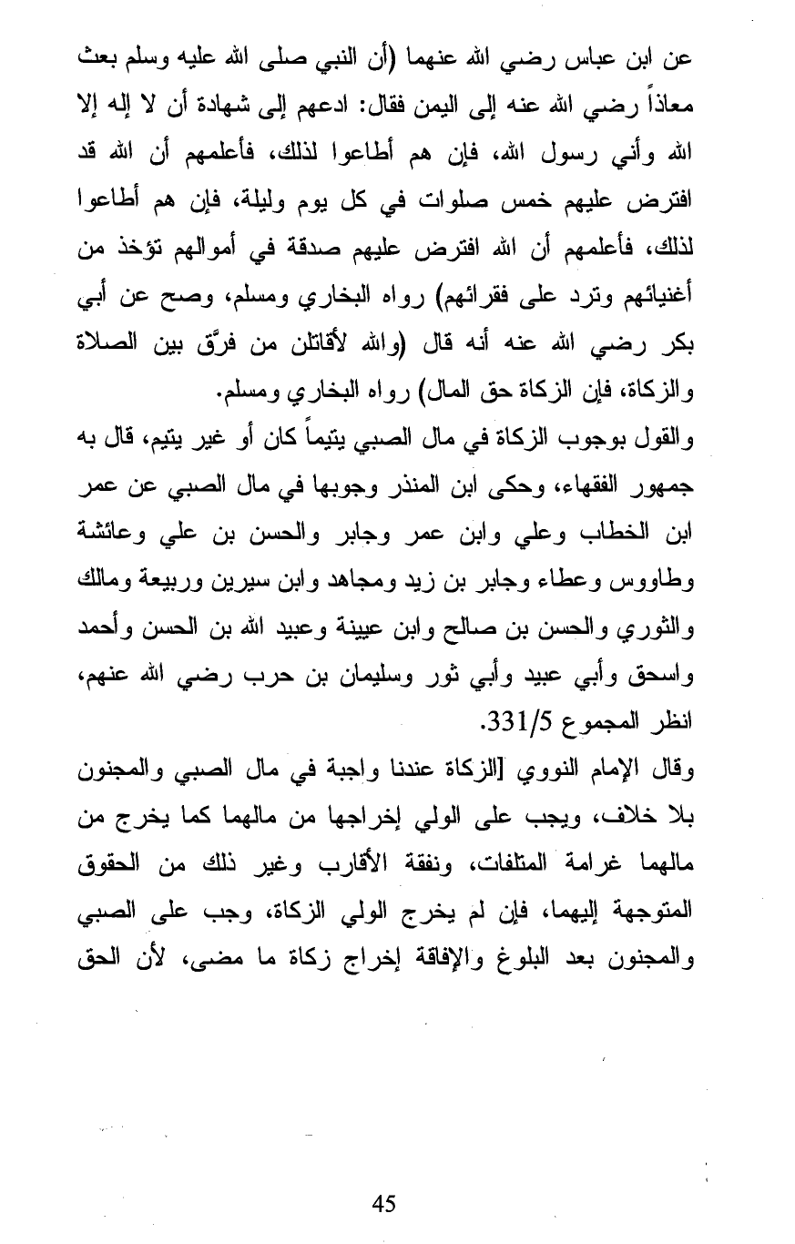 عن ابن عباس رضي الله عنهما (أن النبي صلى الله عليه وسلم بعث معاذاً رضي الله عنه إلى اليمن فقال: ادعهم إلى شهادة أن لا إله إلا الله وأني رسول الله، فإن هم أطاعوا لذلك، فأعلمهم أن الله قد افترض عليهم خمس صلوات في كل يوم وليلة، فإن هم أطاعوا لذلك، فأعلمهم أن الله افترض عليهم صدقة في أموالهم تؤخذ من أغنيائهم وترد على فقرائهم) رواه البخاري ومسلم، وصح عن أبي بكر رضي الله عنه أنه قال (والله لأقاتلن من فرَّق بين الصلاة والزكاة، فإن الزكاة حق المال) رواه البخاري ومسلم.