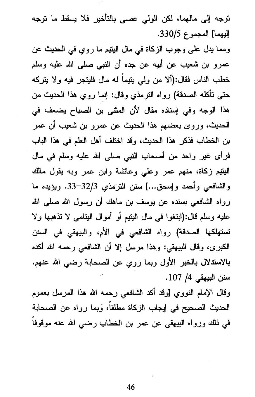 ومما يدل على وجوب الزكاة في مال اليتيم ما روي في الحديث عن عمرو بن شعيب عن أبيه عن جده أن النبي صلى الله عليه وسلم خطب الناس فقال: (ألا من ولي يتيماً له مال فليتجر فيه ولا يتركه حتى تأكله الصدقة) رواه الترمذي وقال: إنما روي هذا الحديث من هذا الوجه وفي إسناده مقال لأن المثنى بن الصباح يضعف في الحديث، وروى بعضهم هذا الحديث عن عمرو بن شعيب أن عمر بن الخطاب فذكر هذا الحديث، وقد اختلف أهل العلم في هذا الباب فرأى غير واحد من أصحاب النبي صلى الله عليه وسلم في مال اليتيم زكاة، منهم عمر وعلي وعائشة وابن عمر وبه يقول مالك والشافعي وأحمد وإسحق ... ] سنن الترمذي 3/ 32 - 33. ويؤيده ما رواه الشافعي بسنده عن يوسف بن ماهك أن رسول الله صلى الله عليه وسلم قال: (ابتغوا في مال اليتيم أو أموال اليتامى لا تذهبها ولا تستهلكها الصدقة) رواه الشافعي في الأم، والبيهقي في السنن الكبرى، وقال البيهقي: وهذا مرسل إلا أن الشافعي رحمه الله أكده بالاستدلال بالخبر الأول وبما روي عن الصحابة رضي الله عنهم. سنن البيهقي 4/ 107.