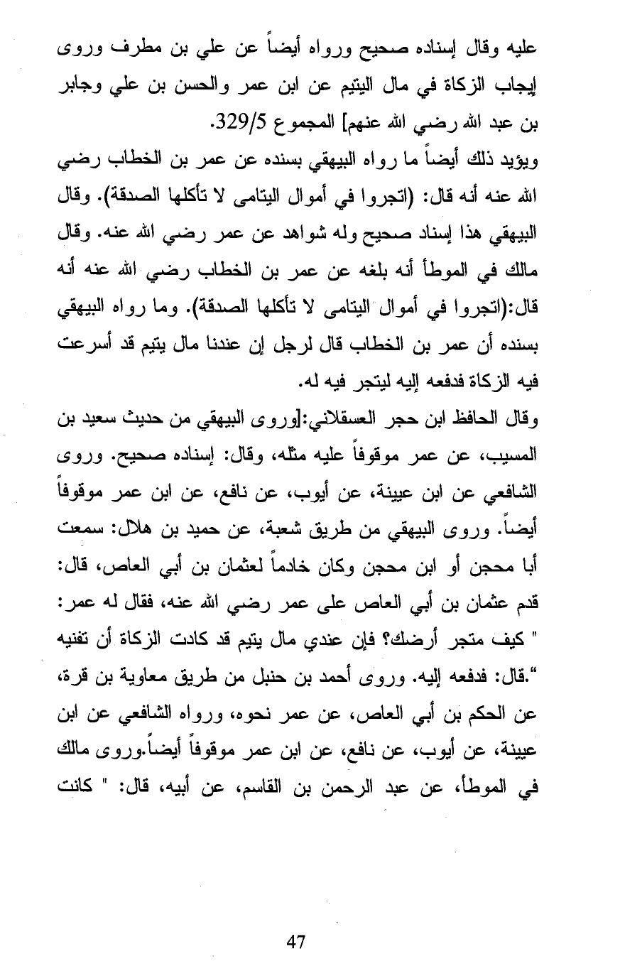 وقال الحافظ ابن حجر العسقلاني: [وروى البيهقي من حديث سعيد بن المسيب، عن عمر موقوفاً عليه مثله، وقال: إسناده صحيح. وروى الشافعي عن ابن عيينة، عن أيوب، عن نافع، عن ابن عمر موقوفاً أيضاً. وروى البيهقي من طريق شعبة، عن حميد بن هلال: سمعت أبا محجن أو ابن محجن وكان خادماً لعثمان بن أبي العاص، قال: قدم عثمان بن أبي العاص على عمر رضي الله عنه، فقال له عمر: " كيف متجر أرضك؟ فإن عندي مال يتيم قد كادت الزكاة أن تفنيه ". قال: فدفعه إليه. وروى أحمد بن حنبل من طريق معاوية بن قرة، عن الحكم بن أبي العاص، عن عمر نحوه، ورواه الشافعي عن ابن عيينة، عن أيوب، عن نافع، عن ابن عمر موقوفاً أيضاً. وروى مالك في الموطأ، عن عبد الرحمن بن القاسم، عن أبيه، قال: " كانت