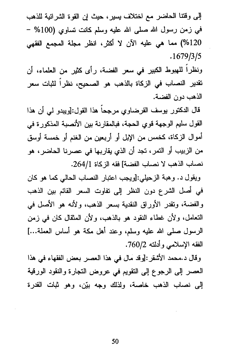 ويقول د. وهبة الزحيلي: [ويجب اعتبار النصاب الحالي كما هو كان في أصل الشرع دون النظر إلى تفاوت السعر القائم بين الذهب والفضة، وتقدر الأوراق النقدية بسعر الذهب، ولأنه هو الأصل في التعامل، ولأن غطاء النقود هو بالذهب، ولأن المثقال كان في زمن الرسول صلى الله عليه وسلم، وعند أهل مكة هو أساس العملة ... ] الفقه الإسلامي وأدلته 2/ 760.
